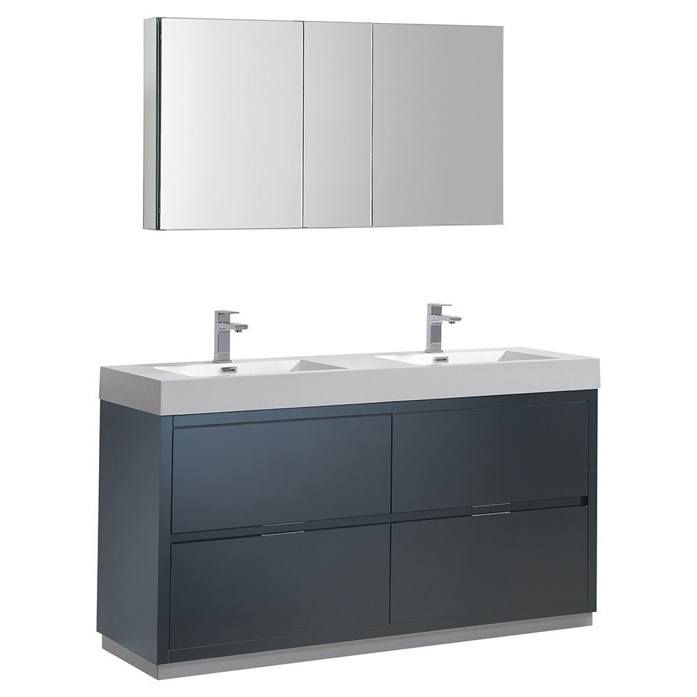 The Fresca Valencia Free Standing Modern Double Sink Bathroom Vanity with Medicine Cabinet comes with everything you need to create an elegant and modern bathroom. The rectangular vanity offers great storage with four soft-closing drawers, just perfect for organizing all of your daily essentials. The drawers feature concealed aluminum handles and the cabinet has a stylish Glossy Dark Slate Gray finish. It rests on an aluminum base, adding to its modern look. The white acrylic-resin countertop with integrated double sinks has smooth lines and a thick profile. The sinks are equipped with an overflow, single hole faucet mounts and include solid brass faucets. This ensemble also comes with a fully mirrored 50" medicine cabinet with four adjustable glass shelves, to complete the look. This lovely vanity is available in multiple sizes and makes a stylish statement in any home.