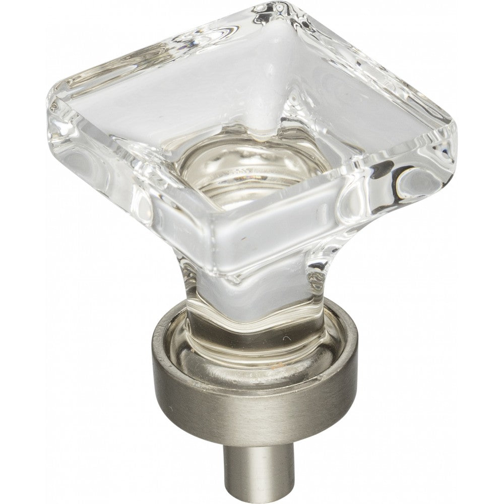 Recalling the glamorous era of Old Hollywood, Harlow glass knobs add excitement and radiance to any kitchen, bath, or closet. This opulent 1" overall length Satin Nickel square shape cabinet knob, also available in a larger size, adds a touch of modern elegance to any space. This Jeffrey Alexander collection offers four finish options, meeting both traditional and transitional design needs. Each item is individually wrapped to protect the item from damage. Attachment hardware is included.