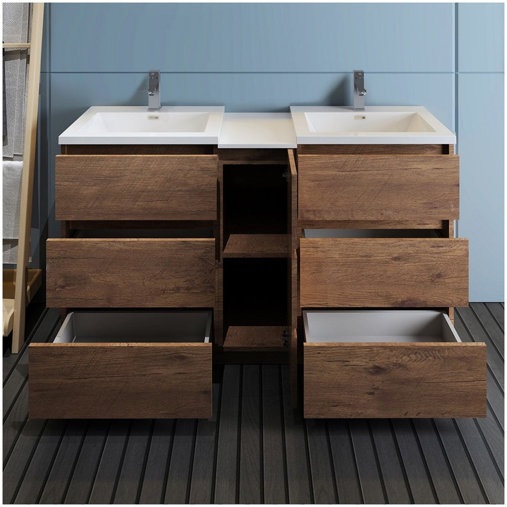 With its chic Rosewood finish, the Fresca Lazzaro Freestanding Modern Bathroom Cabinet with Integrated Double Sink is the ideal combination of style and function. It features a center cabinet with two roomy compartments and six spacious soft-closing wood drawers, ideal for storing and organizing all of your daily essentials. The door and drawers feature push-release hardware, creating a streamlined front that beautifully complements the minimalist design. Gracing the top of the cabinet is an eye-catching white acrylic-resin countertop/double sink with smooth edges and integrated overflow. The sinks have been pre-drilled to accommodate single hole faucets (sold separately). This modern cabinet with integrated double sink will enhance any decor and is available in multiple sizes and finishes. It includes installation hardware