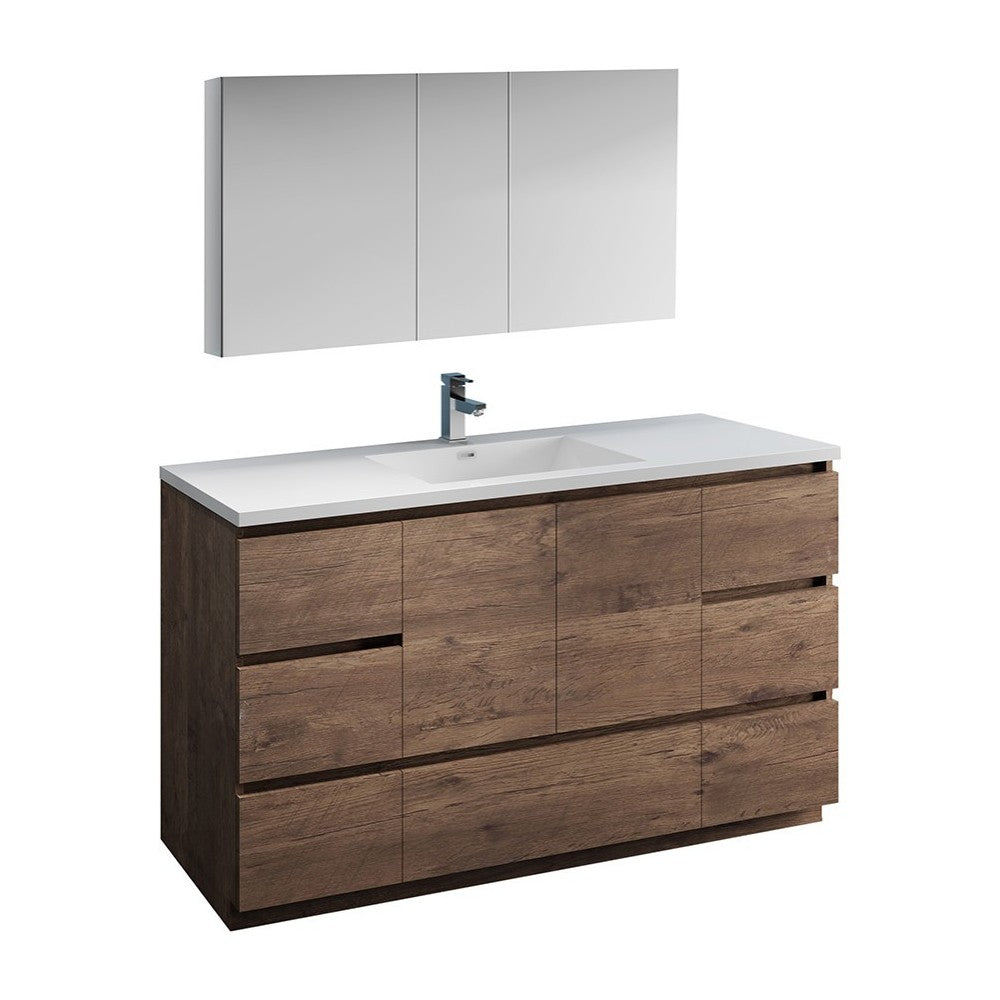 With its chic Rosewood finish, the Fresca Lazzaro Freestanding Modern Bathroom Vanity is the ideal combination of style and function. Measuring 60" in width, this freestanding bathroom cabinet offers elegant simplicity and superior storage. Spacious soft-closing wood drawers can hold all of your bathroom essentials, while a roomy under-the-sink compartment provides additional space for tucking away towels or storage baskets. The drawers and doors feature push-release hardware, offering a streamlined front that beautifully complements the minimalist design. Gracing the top of the cabinet is an eye-catching white acrylic-resin countertop/sink with smooth edges and integrated overflow. The sink is designed for durability and style and has been pre-drilled to accommodate a single hole faucet (included). This vanity also comes with a fully mirrored medicine cabinet with four adjustable glass shelves, to complete the look. This modern vanity is available in multiple colors and makes a stylish statement in any home