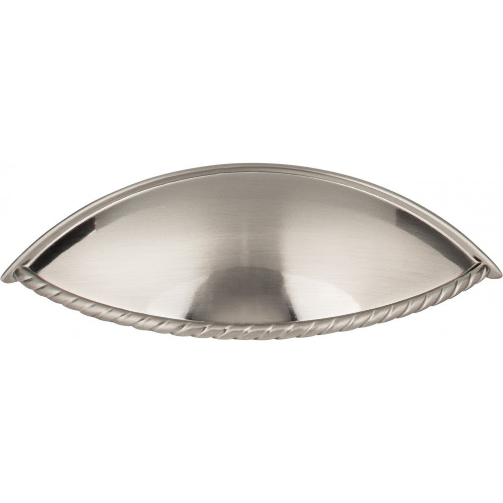- 5" Overall Length Shaker Cabinet Cup Pull with Rope Detail. Holes are 96 mm center-to-center. Packaged with two 8-32 x 1" and two Break-away screws. Finish: Satin Nickel