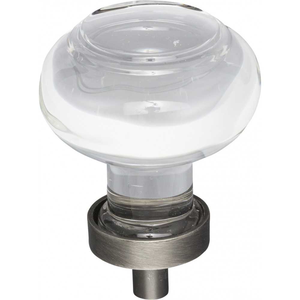 Recalling the glamorous era of Old Hollywood, Harlow glass knobs add excitement and radiance to any kitchen, bath, or closet. This "cute as a button" 1-7/16" diameter Brushed Pewter button shaped cabinet knob is also available in a larger diameter to fit any cabinet or drawer size. This Jeffrey Alexander collection offers four finish options, meeting both traditional and transitional design needs. Each item is individually wrapped to protect the item from damage. Attachment hardware is included.