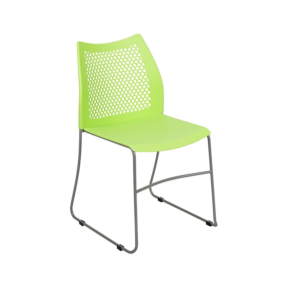Grab the attention of visitors when they step into your meeting space and see these smart looking guest chairs. This modern beauty features a fully perforated back to provide airflow during conference hall meetings. Designed for versatility this chair is designed for reception areas, school functions, break rooms, cafeterias, event spaces and express emission testing locations where customers must get out their vehicle. Always be ready for guests by having several plastic guest chairs tucked away in your home. If you work in grungy environments and need a chair that is easy to clean plastic stack chairs are ideal. Store or transport up to 5 chairs on our compatible steel sled base stack chair dolly. When in need of a space-saving seating solution that is permanent or temporary, allow this stackable side chair to work for you. [RUT-498A-GN-GG]