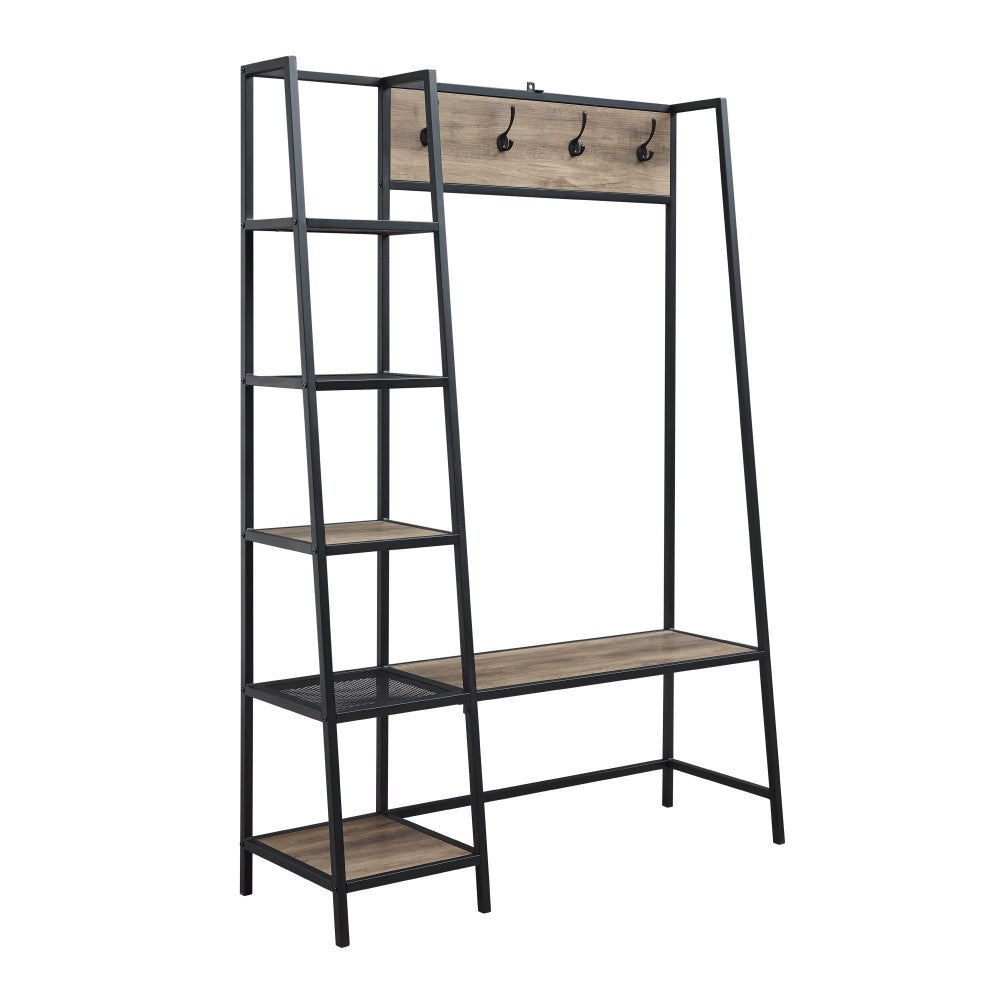Add a rustic touch to the entrance of your home with this modern industrial hall tree. The mixed-material design and metal mesh shelves create an urban background for outdoor gear, pet accessories, and other essentials. Four metal coat hooks and five open shelves provide plenty of open storage for hats, coats, scarves, and bags. The sturdy bench offers a convenient seat as you slide your shoes on as you head out the door. Finished with a melamine coating, the warp-resistant MDF wood is sure to last through any season.