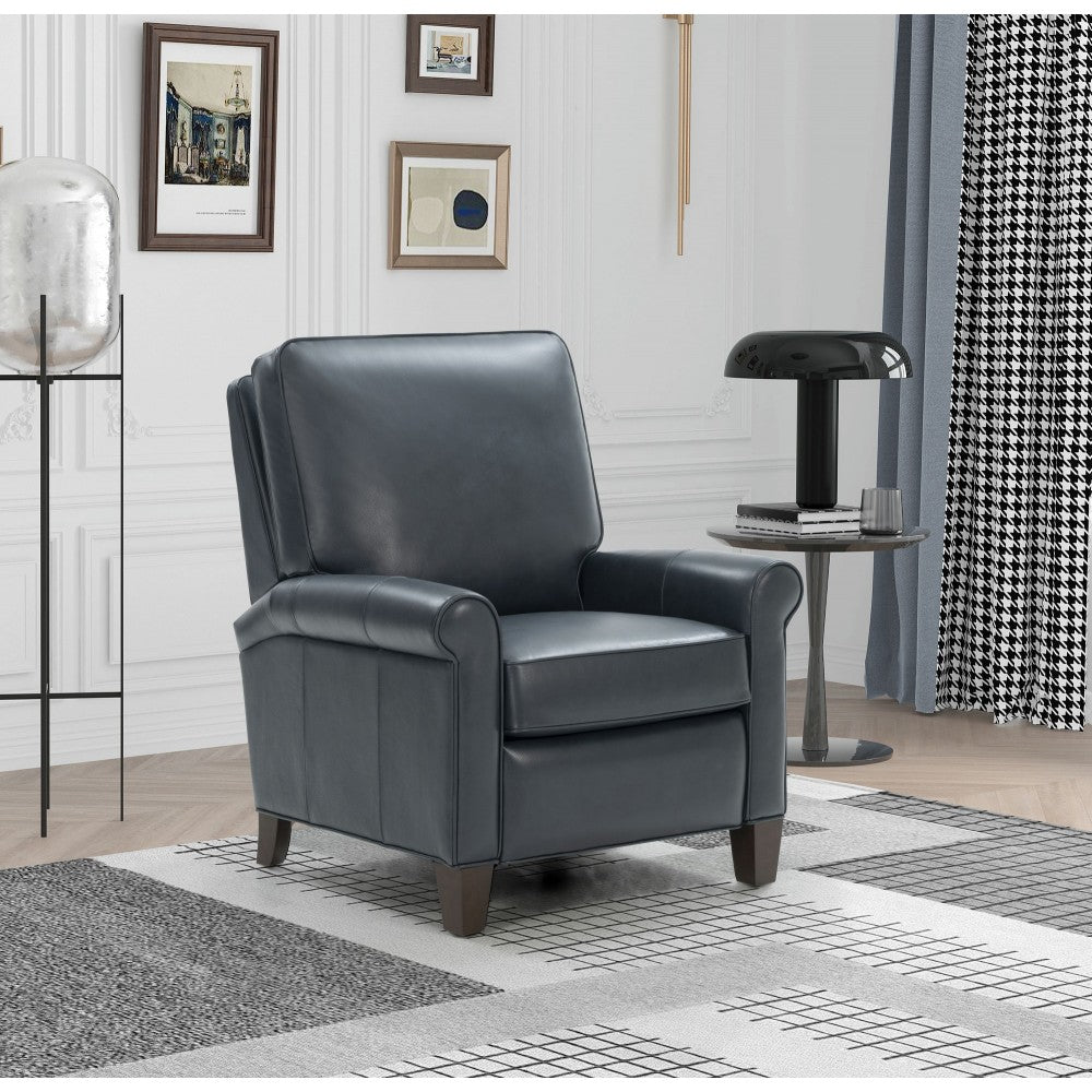 Smaller scale transitional low leg push thru the arm recliner. Attached welted plain pillow back, welted rolled arms, tight welted box seat cushion with pocketed coil springs encased in foam, wrapped in Dacron with a down blend feather topper for plush comfort and lasting durability.