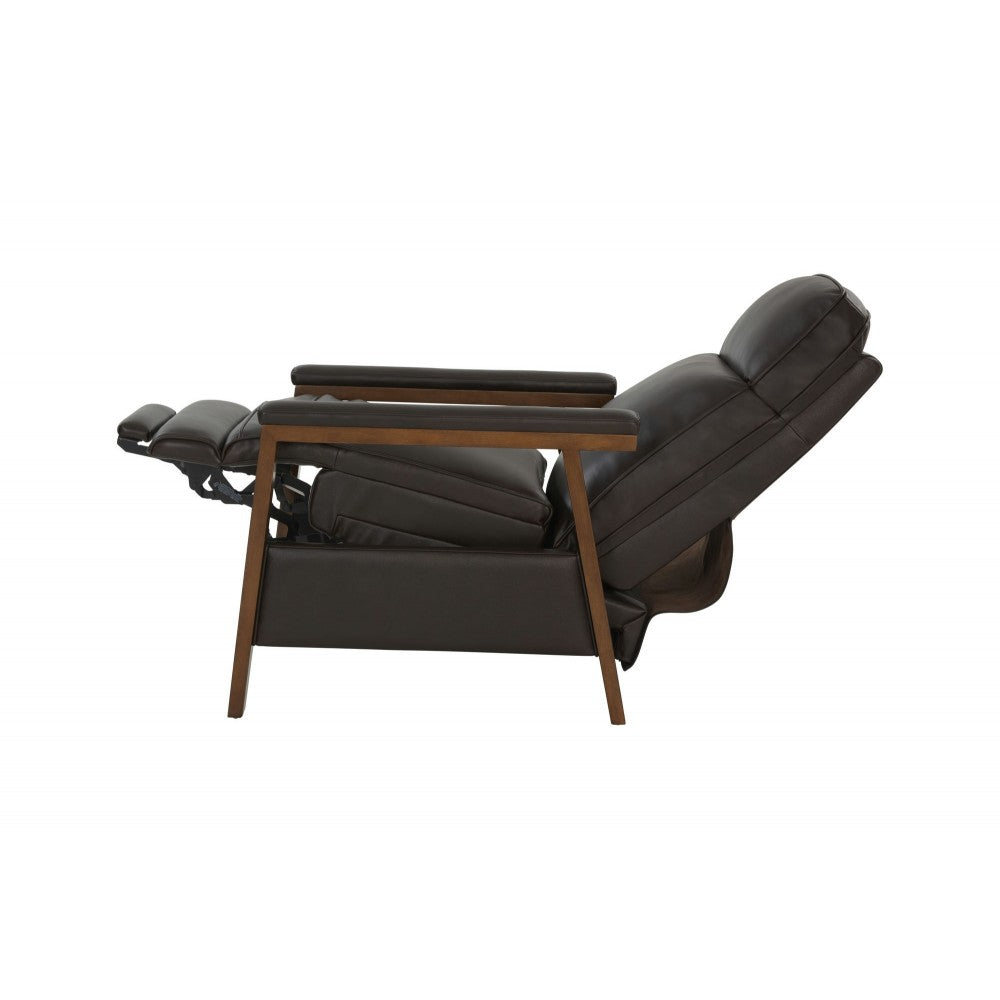 Modern exposed wood frame, push thru the arm 3-way recliner featuring a welted box seat styled pad over chaise with pocketed coil springs, split 43.3" high pub back, and upholstered cap arms. Rustic brown finish.