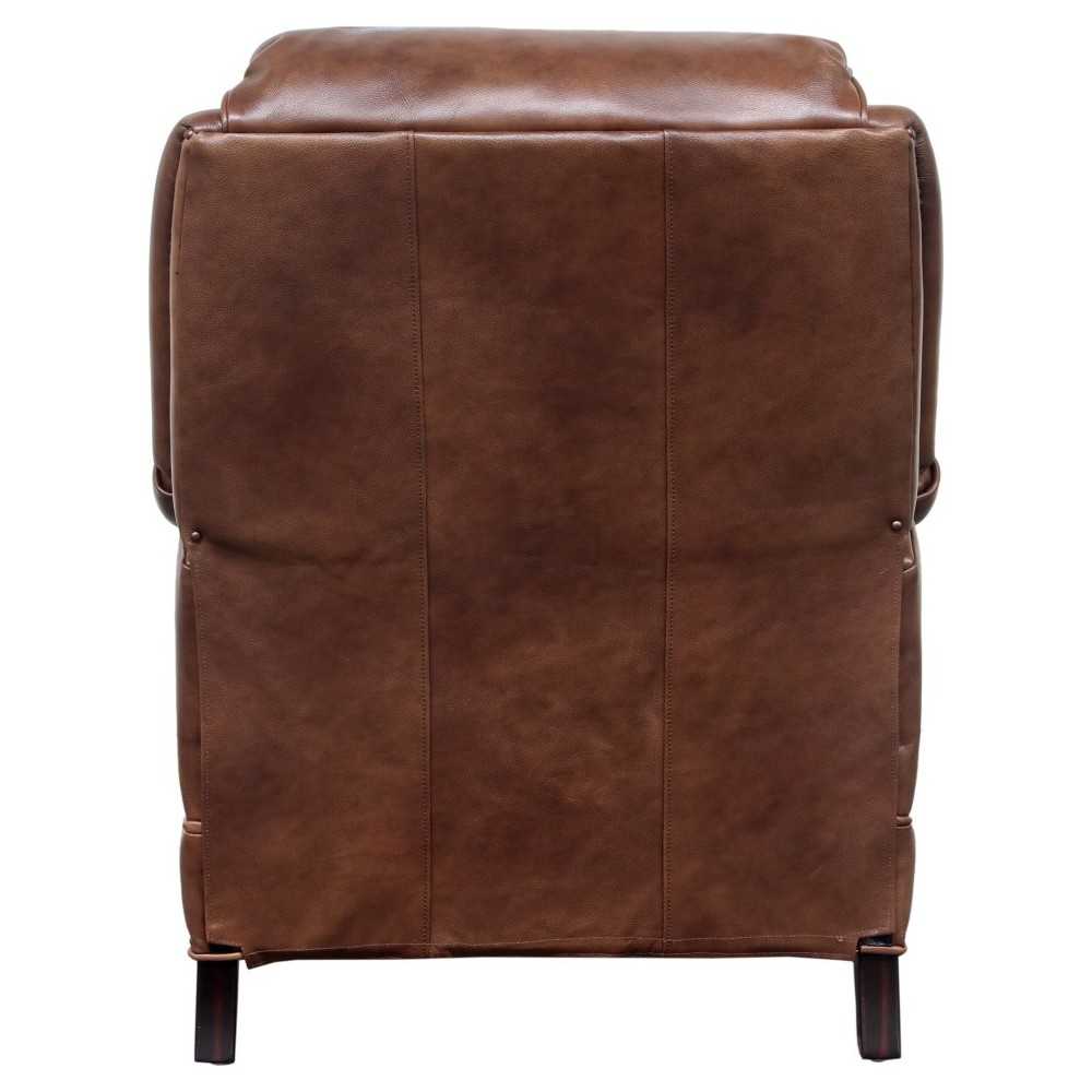 Smaller scale push thru the arms 3 way recliner with footrest extension, flared rolled arms, nail head trim on the shaped lower side rails and ottoman. Attached back cushion. Welted loose box seat cushion with pocketed coil springs and a down blend feather topper. Merlot finished taper wood legs.