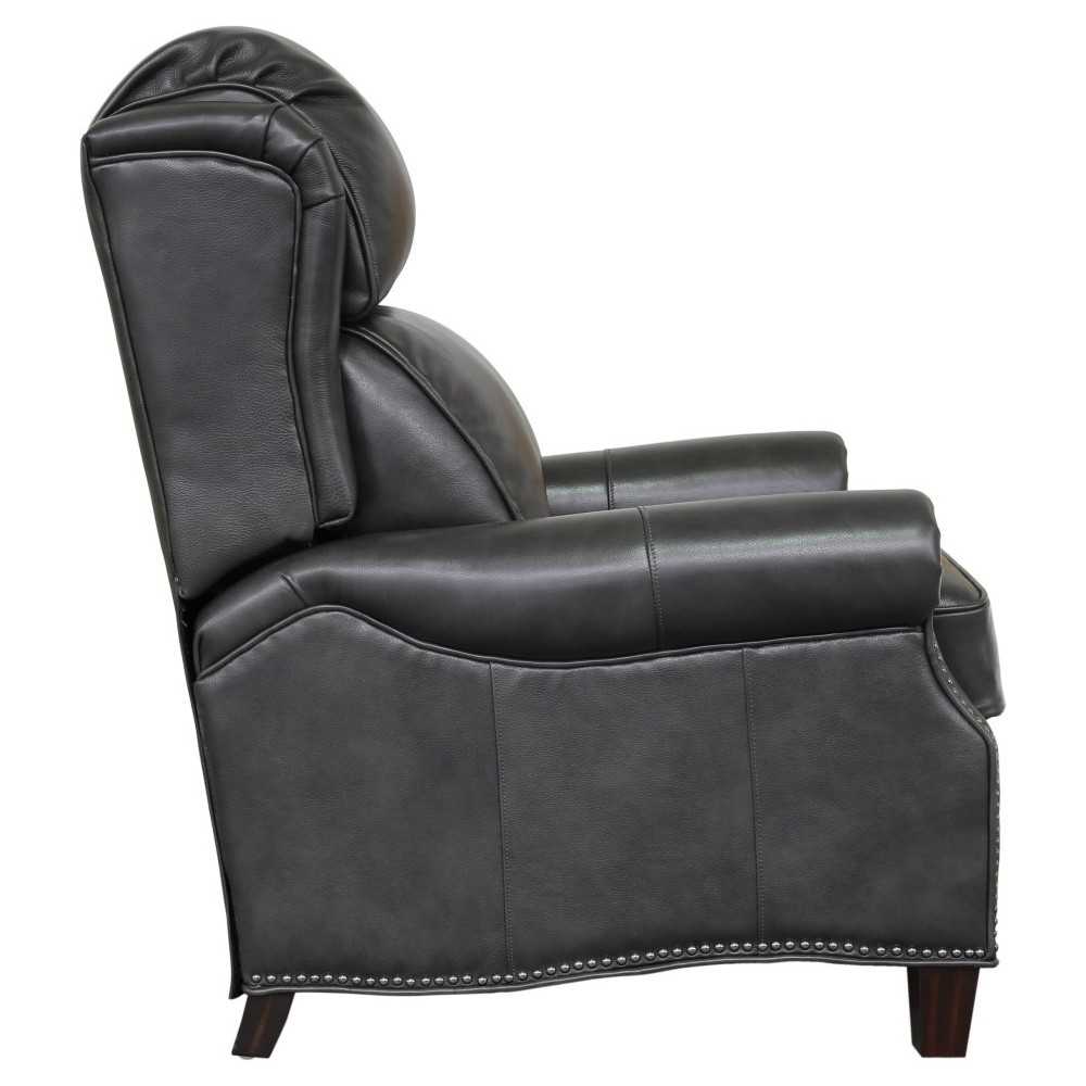 Classic smaller scale wing back lounge chair recliner. 3 way push thru the arms mechanism with footrest extension. Kneed back rolled arms with copper finished nail head trim. Adjustable semi attached pub back, boxed loose seat cushion with pocketed coils and down blend feather wrap. Shaped lower side rails and footrest. Merlot finished tapered wood legs.