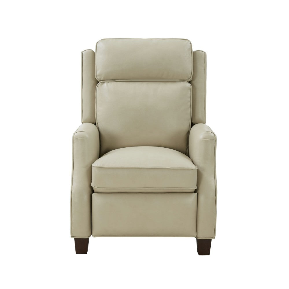 Classic high back push thru the arms recliner with articulated head rest area for extra head support. Pocketed coil welted boxed seat cushion and mahogany finished wood legs complete this sophisticated look.