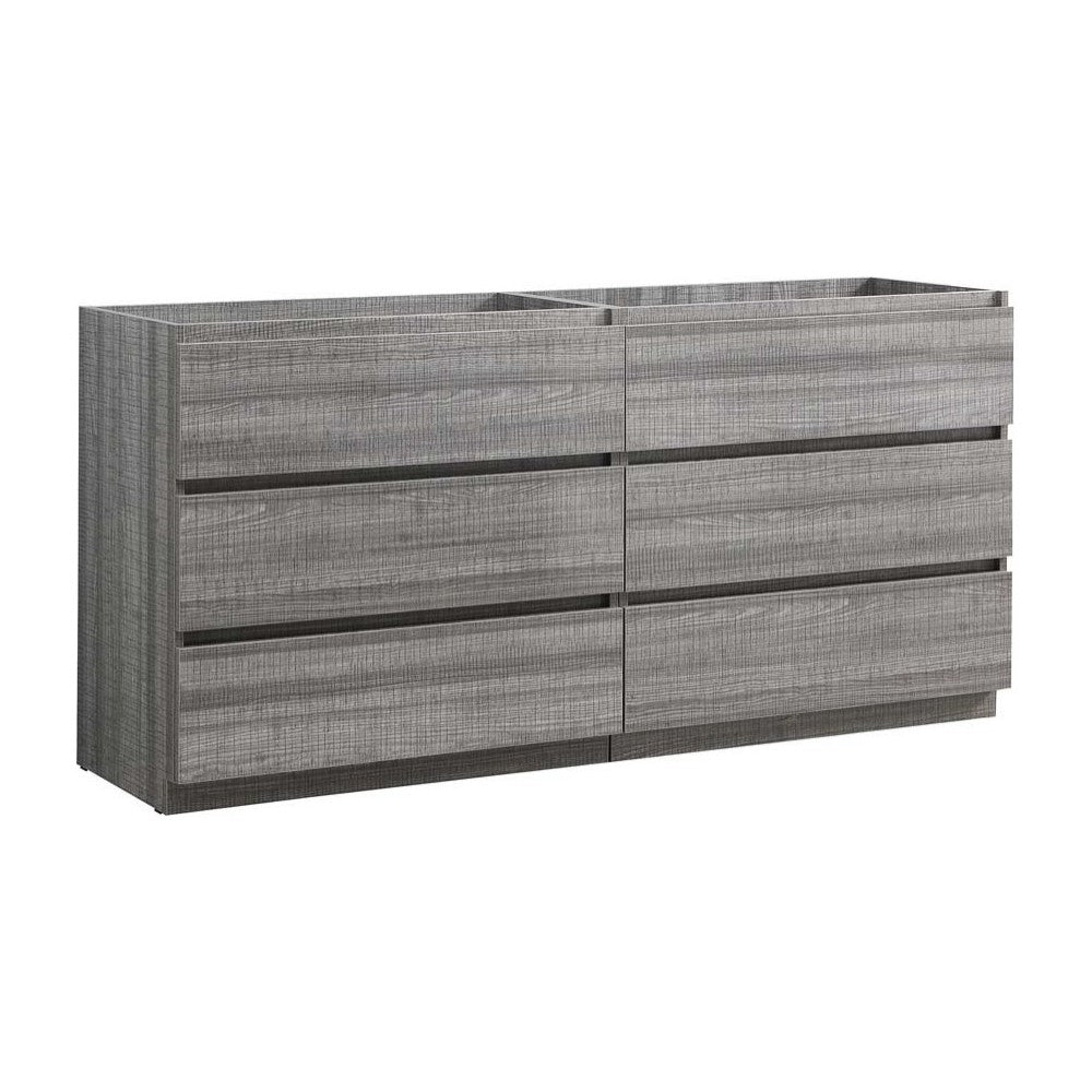 With its chic Ash Gray finish, the Fresca Lazzaro Freestanding Modern Double Sink Bathroom Cabinet is the ideal combination of style and function. Six spacious soft-closing wood drawers offer wonderful storage space, perfect for keeping all of your daily essentials out of sight and the family organized. The drawers feature push-release hardware, offering a streamlined front that beautifully complements the minimalist design. This modern cabinet will enhance any decor and is available in multiple sizes and finishes. It includes installation hardware