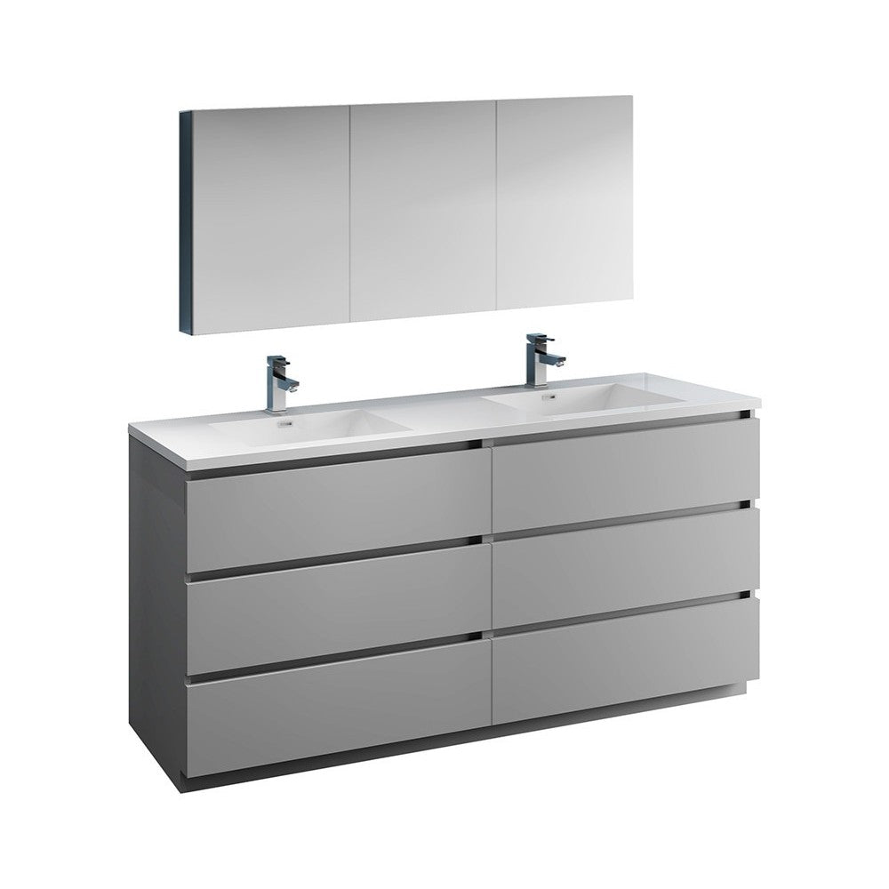 With its chic Gray finish, the Fresca Lazzaro Freestanding Modern Double Sink Bathroom Vanity is the ideal combination of style and function. Six spacious soft-closing wood drawers offer wonderful storage space, perfect for keeping all of your daily essentials out of sight and the family organized. The drawers feature push-release hardware, offering a streamlined front that beautifully complements the minimalist design