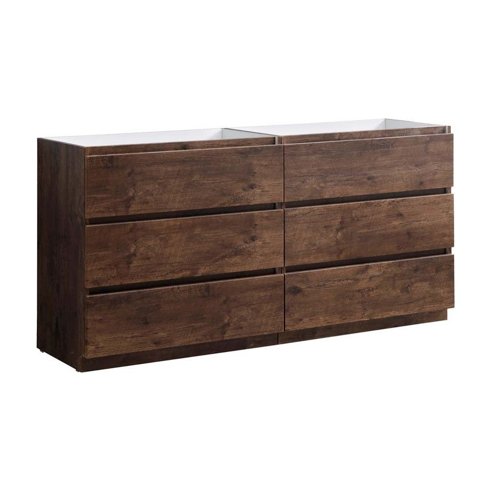 With its chic Rosewood finish, the Fresca Lazzaro Freestanding Modern Double Sink Bathroom Cabinet is the ideal combination of style and function. Six spacious soft-closing wood drawers offer wonderful storage space, perfect for keeping all of your daily essentials out of sight and the family organized. The drawers feature push-release hardware, offering a streamlined front that beautifully complements the minimalist design. This modern cabinet will enhance any decor and is available in multiple sizes and finishes. It includes installation hardware