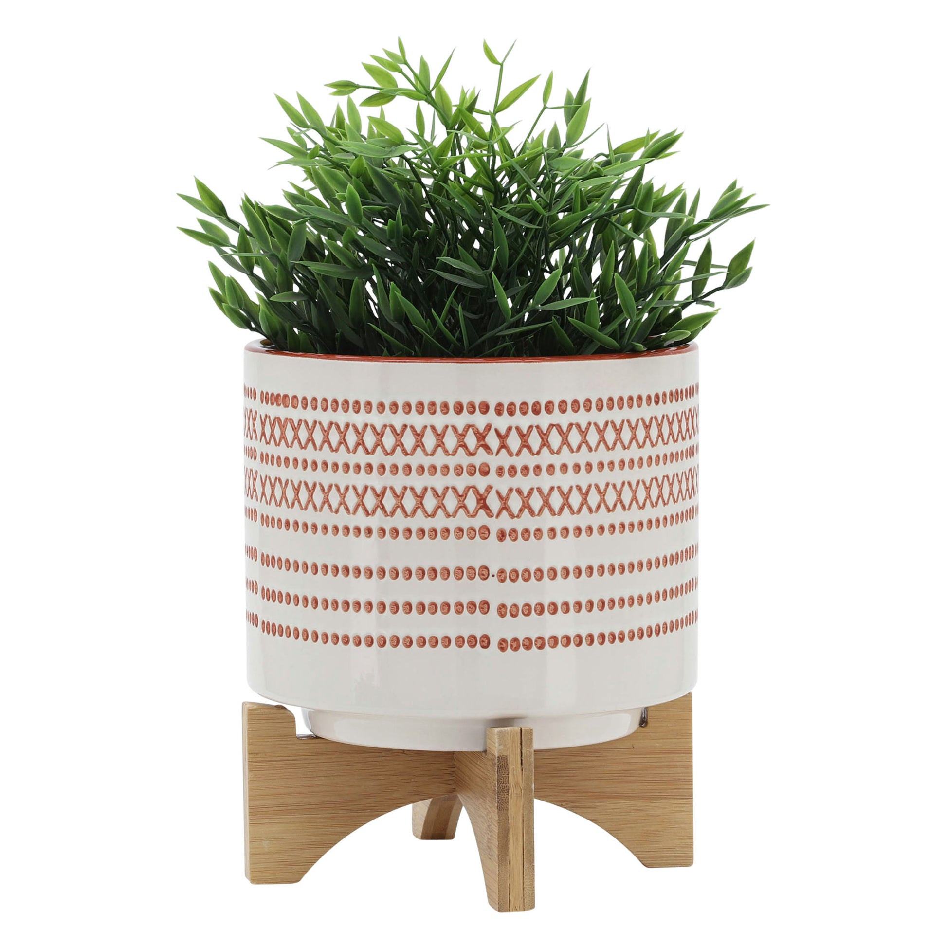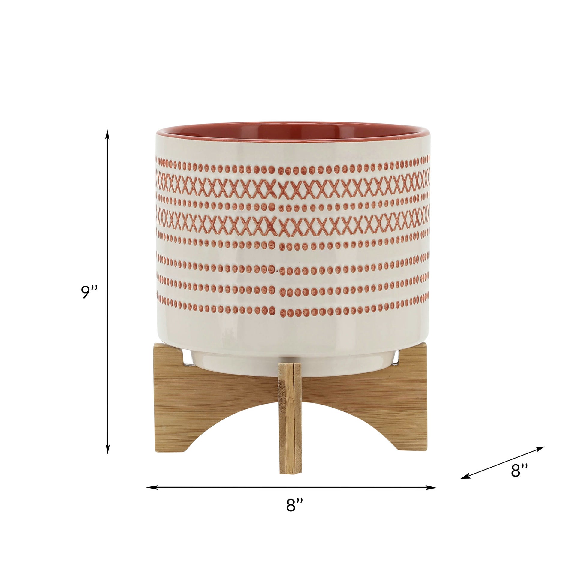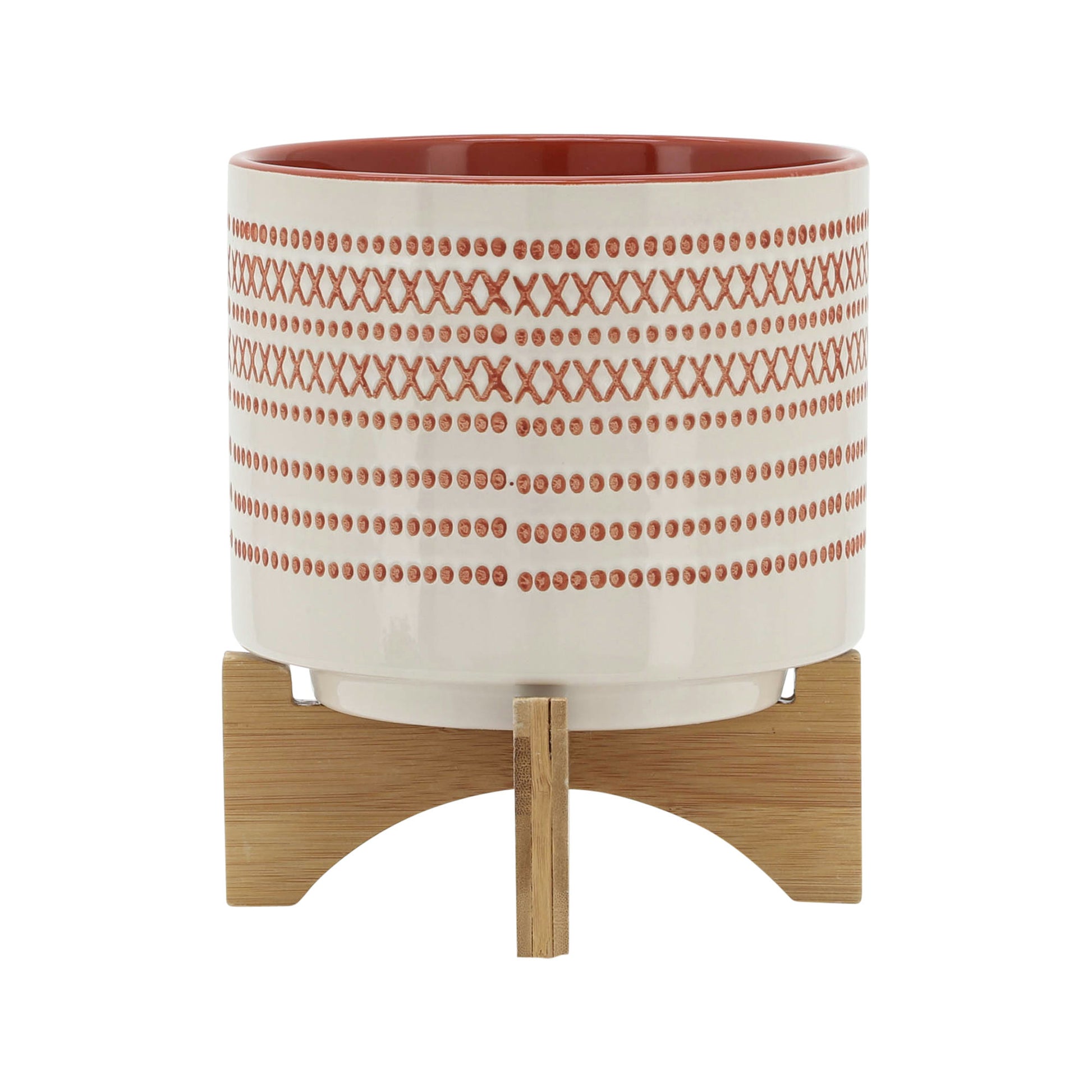 8" Aztec Planter with wood stand, Red. Made of ceramic with a Aztec Pattern, Crème base with a red pattern. The Aztec pattern creates more depth and dimension. Planter does not have drainage holes. The perfect planter for planting succulents, terrariums, and indoor house plants.Sagebrook Home has been formed from a love of design, a commitment to service and a dedication to quality. They create and import fashion forward items in the most popular design styles. Backed with years of experience in the textile field, They are now providing a complete Home decor story. the combination of wall decor, furniture, lighting and Home accessories are all coordinated with textiles to provide a complete Home look. Sagebrook Home is committed to providing the best Home decor and accent pieces at value prices.