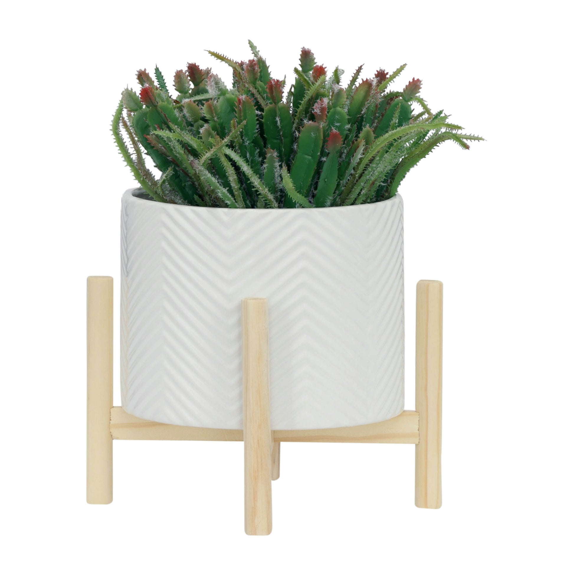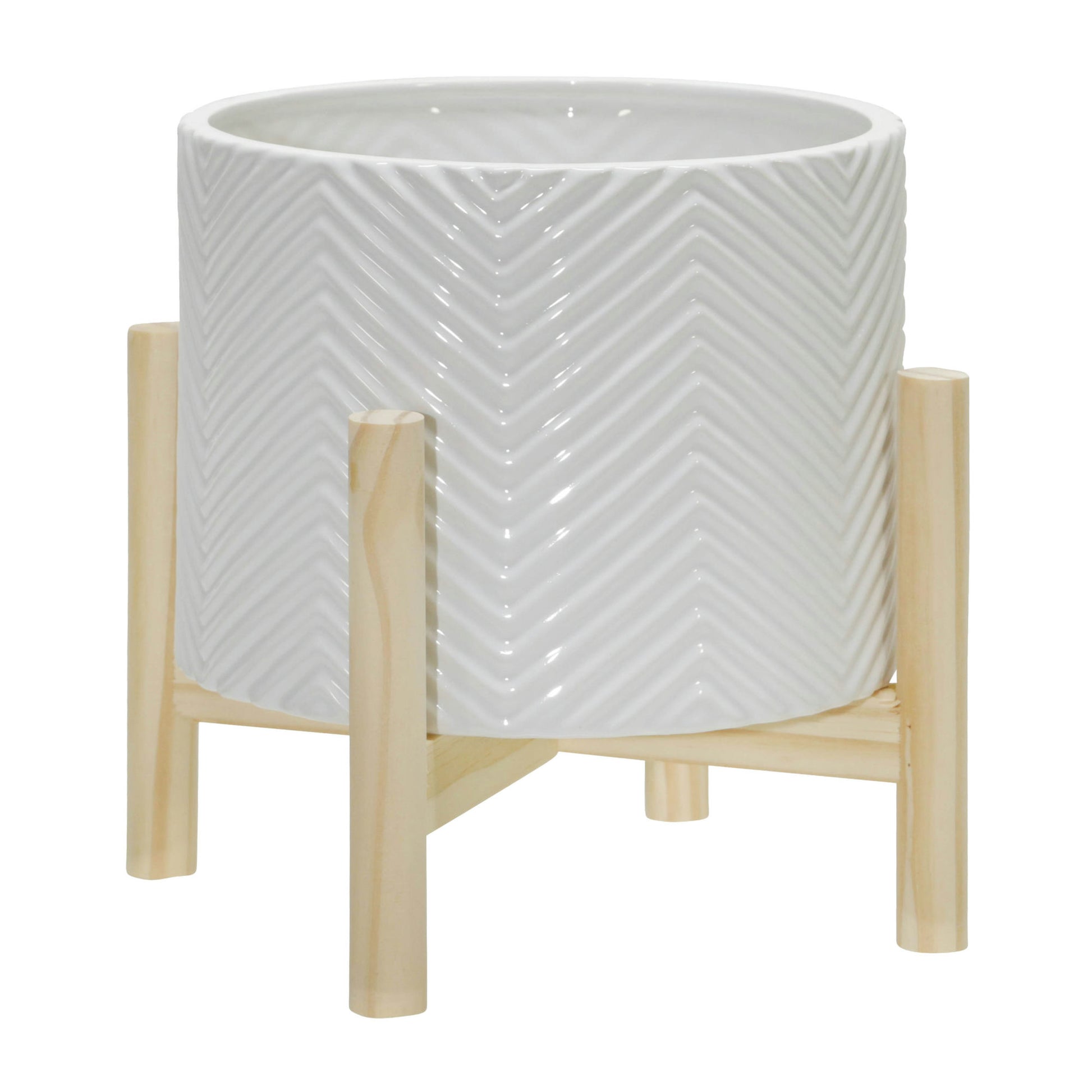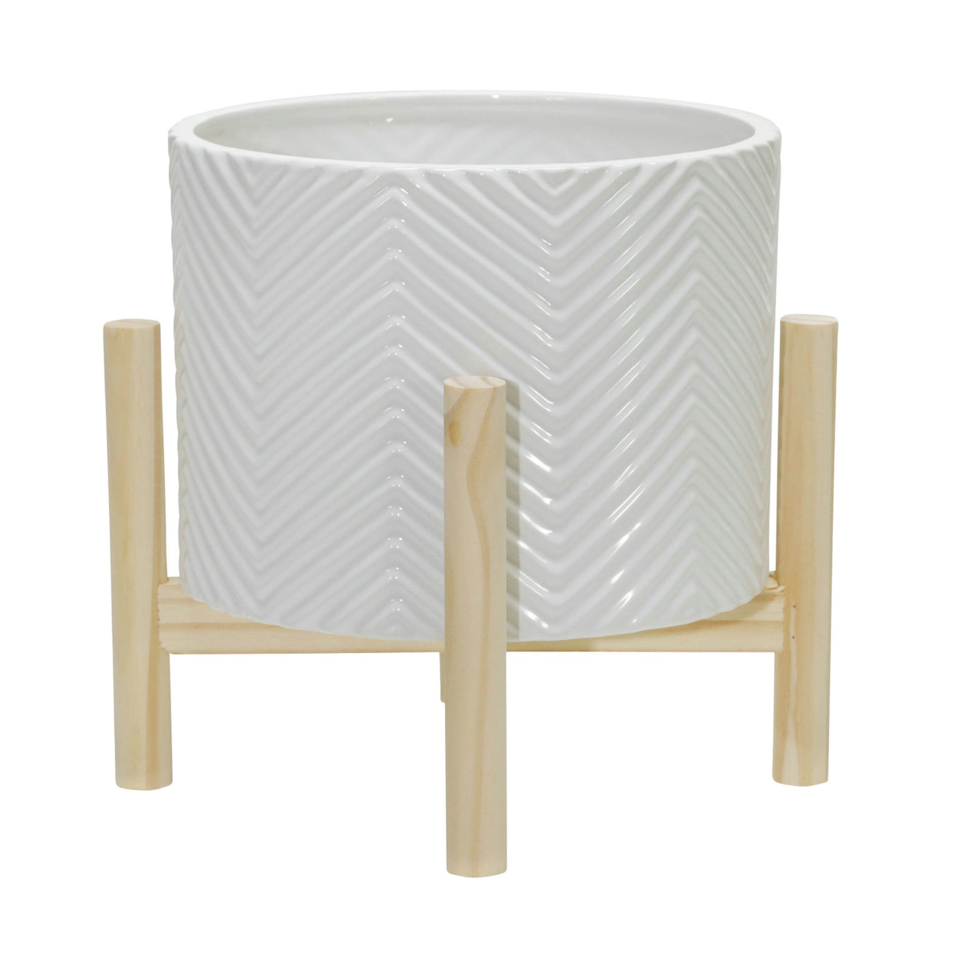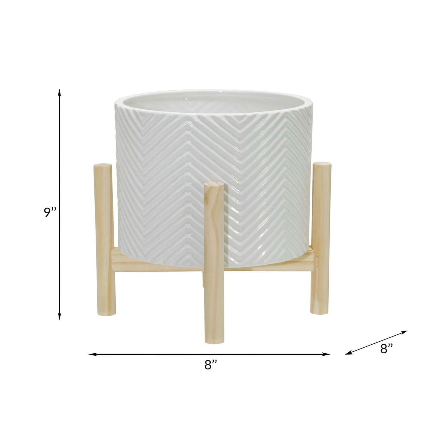 8" Ceramic Chevron Planter W/ Wood Stand, White