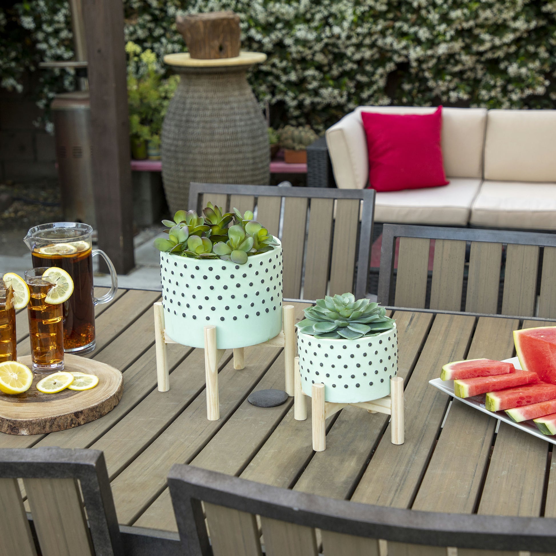 8" Ceramic Dotted Planter W/ Wood Stand, Green