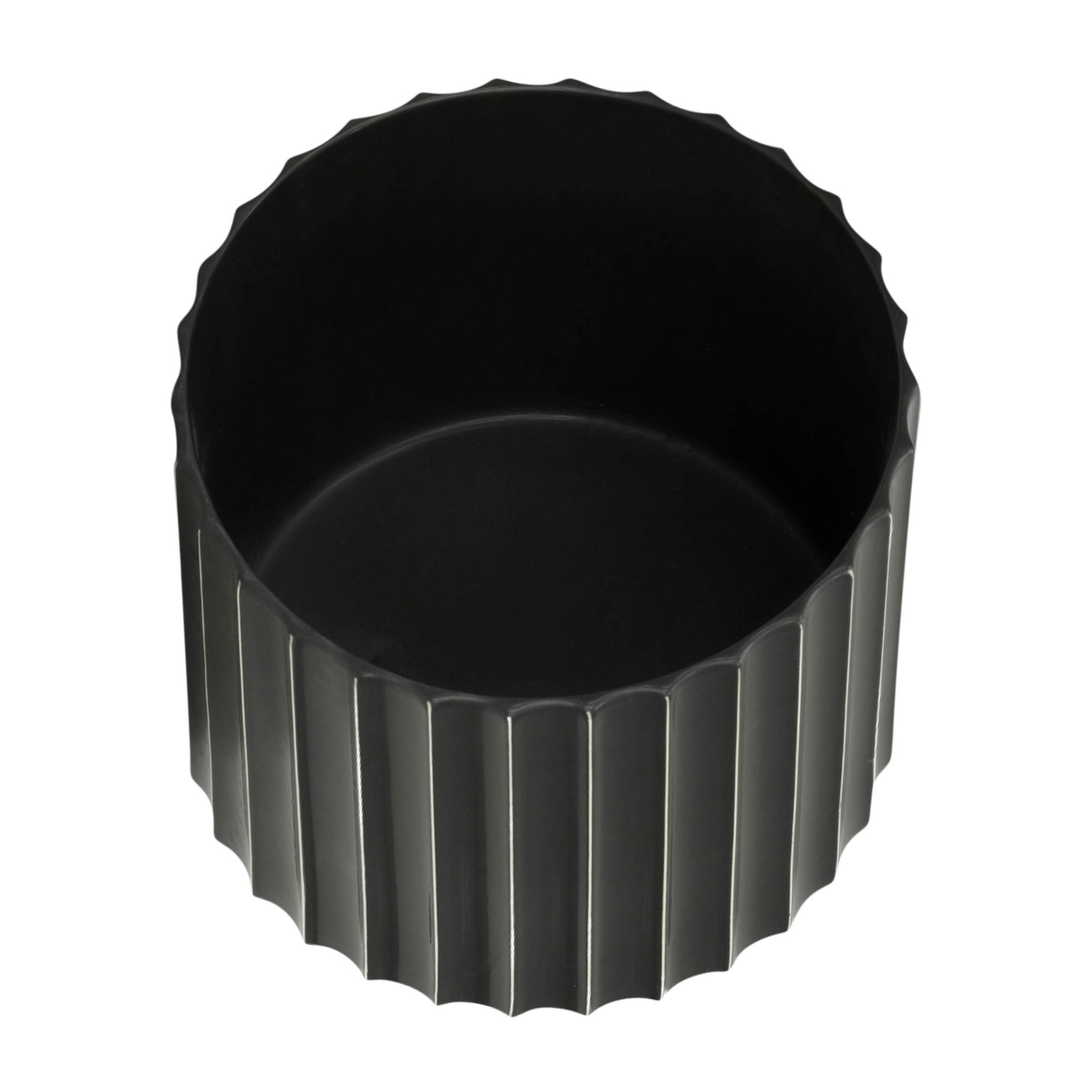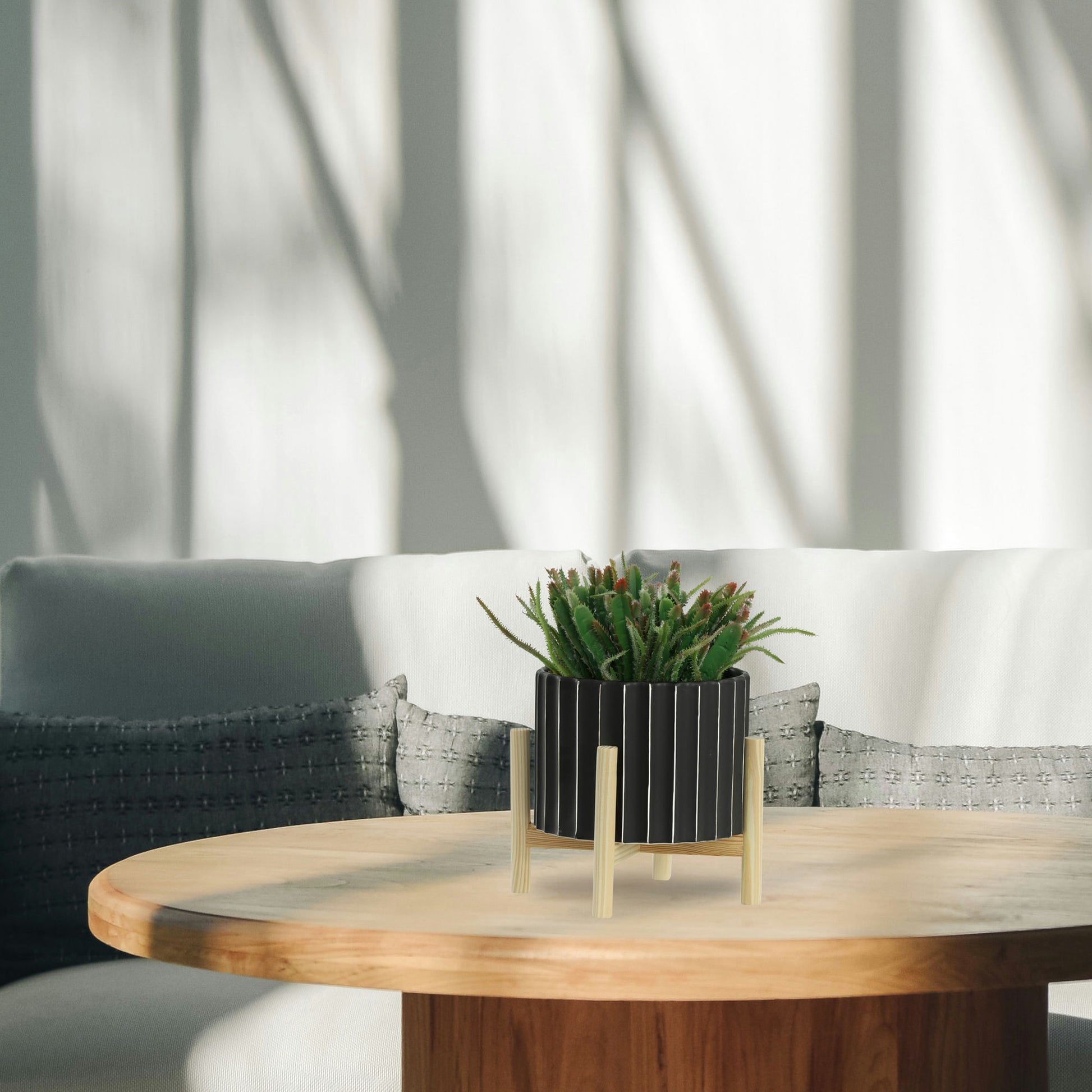 8" Ceramic Fluted Planter W/ Wood Stand, Black