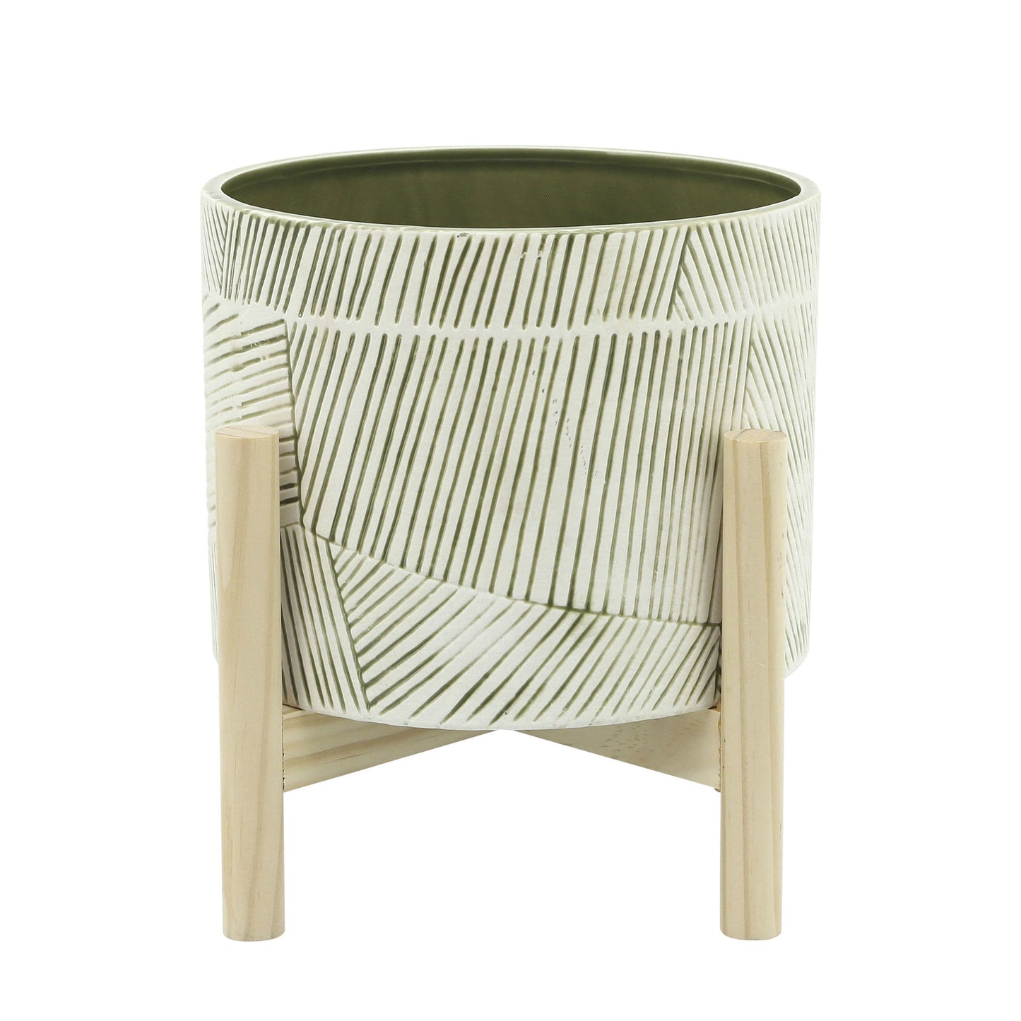 8" Ceramic Planter W/ Wood Stand, Green Mix