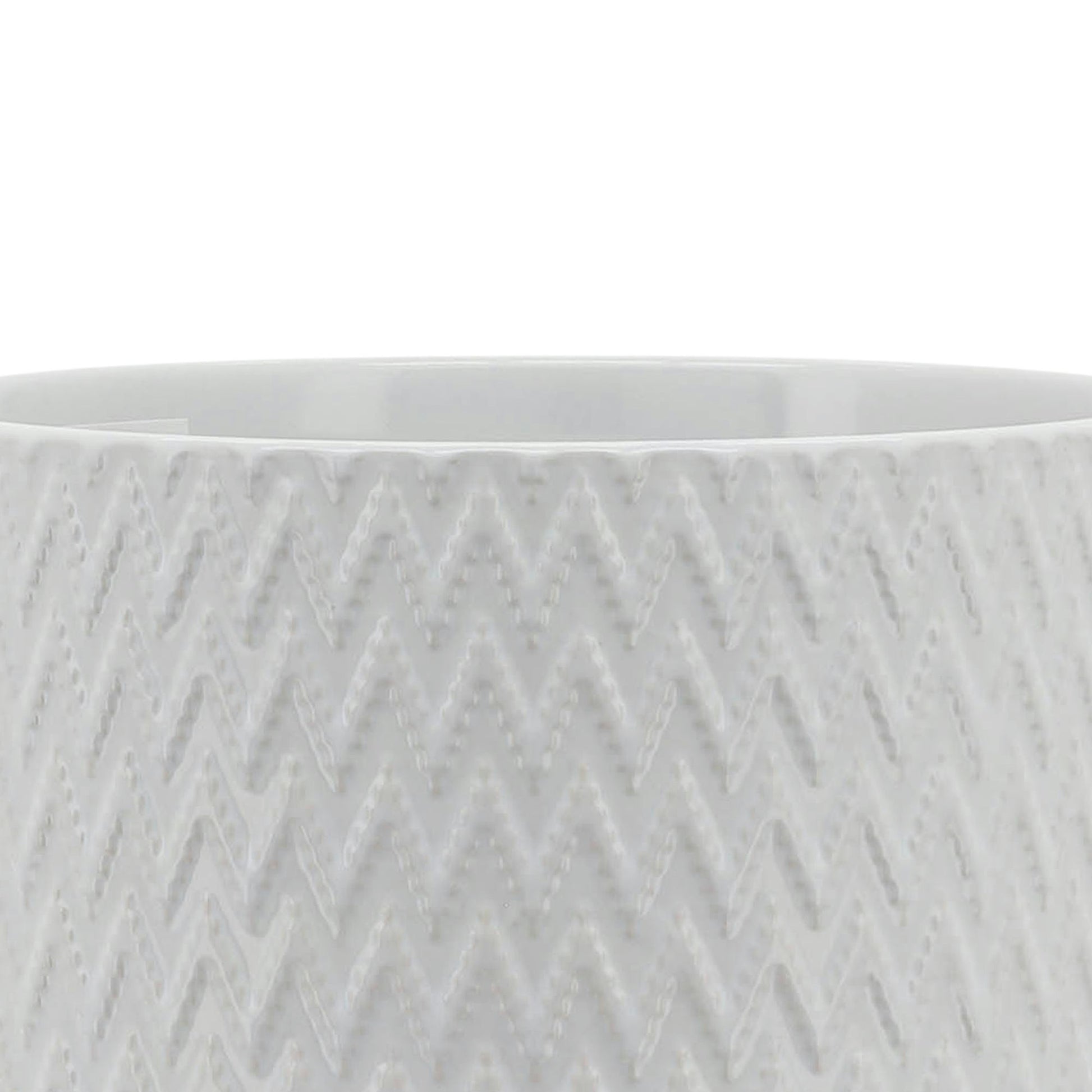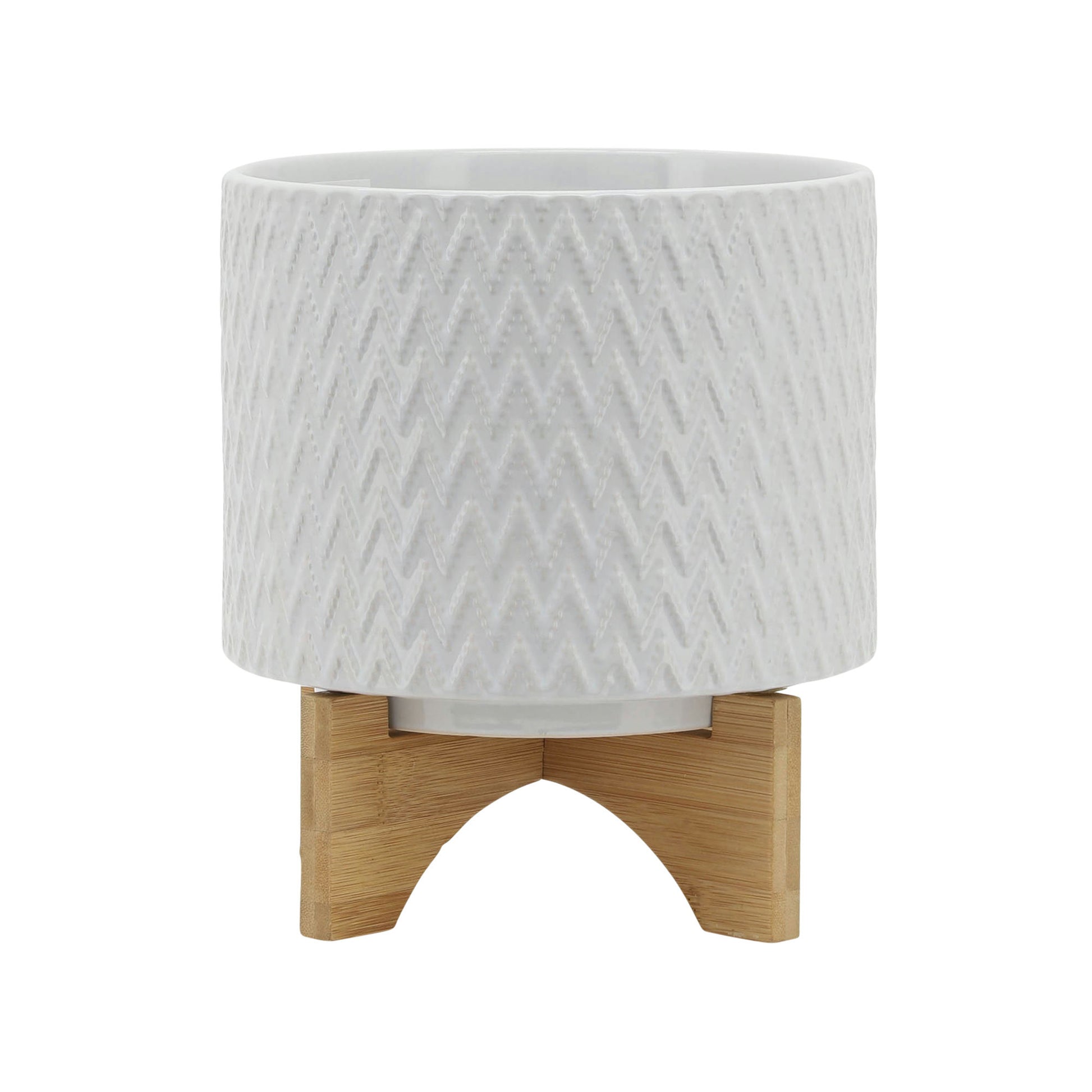 8" Ceramic Chevron Planter with Wood Stand. This light grey planter is an attractive piece on its own. Combined with a wood shelf/stand, it makes a modern statement in addition to holding plants. Planter does not have drainage holes. The perfect planter for planting succulents, terrariums, and indoor house plants. Planter is a light grey ombre with a glossy finish.