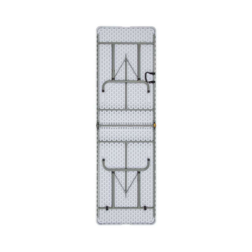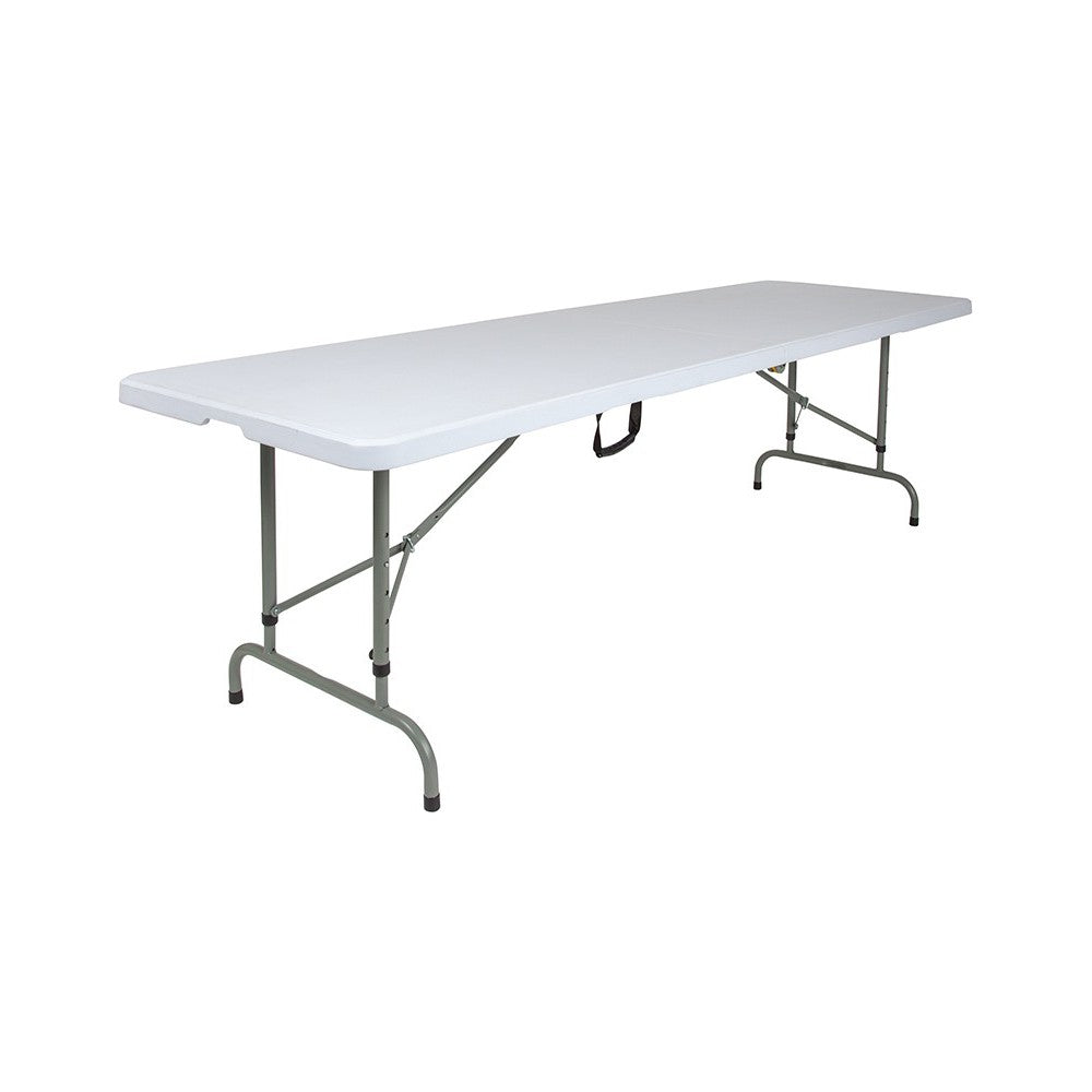 If you attend trade shows and have catalogs and products to display this portable folding table with carrying handle will make your life a little easier. Have your table standout at expos by draping a floor length table cover over the table and offering sweets to engage people as they walk by. Adjust this table to suit the needs of your occasion to accommodate different seat and standing heights. After events the legs lock into place underneath the top and folds in half to transport with less effort. Be unbothered when your relatives invite additional friends to the barbecue, you'll have plenty of space on this 8' long centerfold table. This event folding table accommodates up to 10 adults to throw big birthday parties and host baby showers. This ready to use table is commercial grade and is often used in restaurants, warehouses, schools, churches and recreation centers. Event rental venues keep rectangle folding tables on the premises as they are the most used to accommodate parties of all sizes. Rectangular tables can be arranged to create a u-shape to allow space for a dance floor. Easy to clean and store, plastic folding tables are the best and most popular option for any occasion. Although designed for indoor events this party table can be used outdoors during good weather but must be stored indoors. Invite everyone to the celebration when you have this 30x96 plastic folding table readily available at your home or business. [RB-3096FH-ADJ-GG]