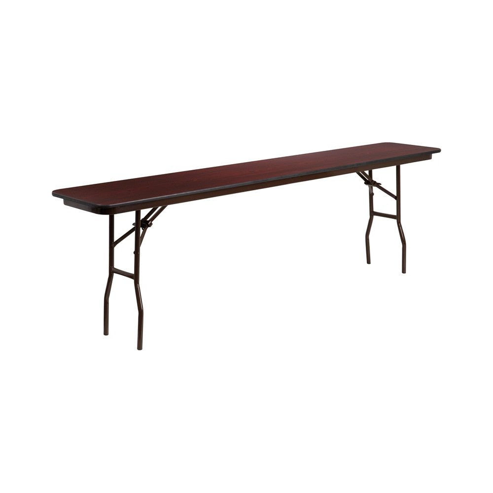 Whether you have a dedicated classroom or a multi-use facility that hosts a myriad of events you need versatile tables that can adapt to their settings. This melamine laminate rectangular folding table with a mahogany finish is invaluable for seminars, conferences and employee training. The space saving design allows multiple tables in a small to large setting making it the perfect training style table. The table legs fold under the table to make storage more convenient and for better portability. This commercial grade table is built to withstand everyday use in the hospitality industry. [YT-1896-MEL-WAL-GG]