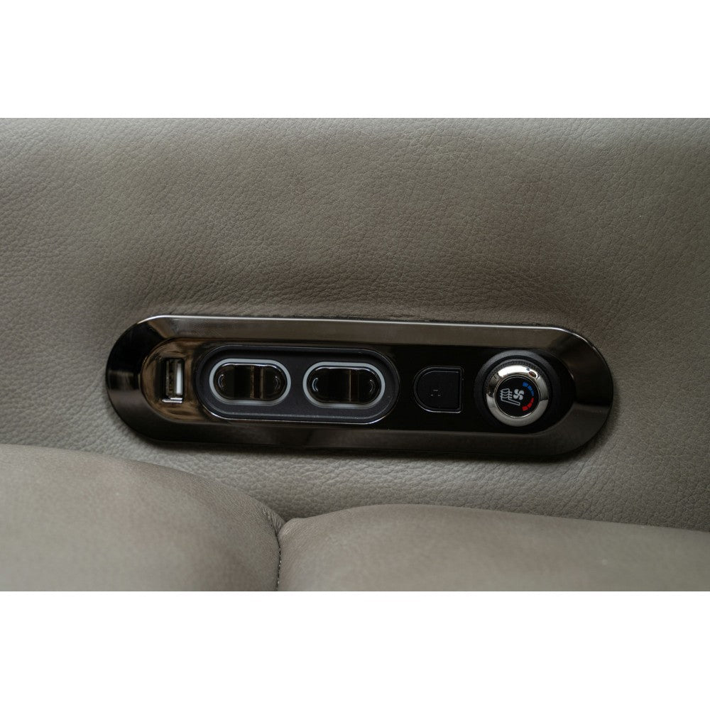 A perfect combination of clean line design and the ultimate in seating comfort. Wall proximity power recliner with power head rest and heated and cooled seat. Flared slim line arm pillows and pad over chaise seating with pocketed coil springs provide head to toe comfort. Perforated leather panels in the seat and lower back allow warm or cool air to gently pass through. 3-level temperature control knob with light indicator allows you to select the exact setting for your personal comfort. The power controller operates the power recliner, power head rest, and temperature. There is also a USB port to keep your devices charged.