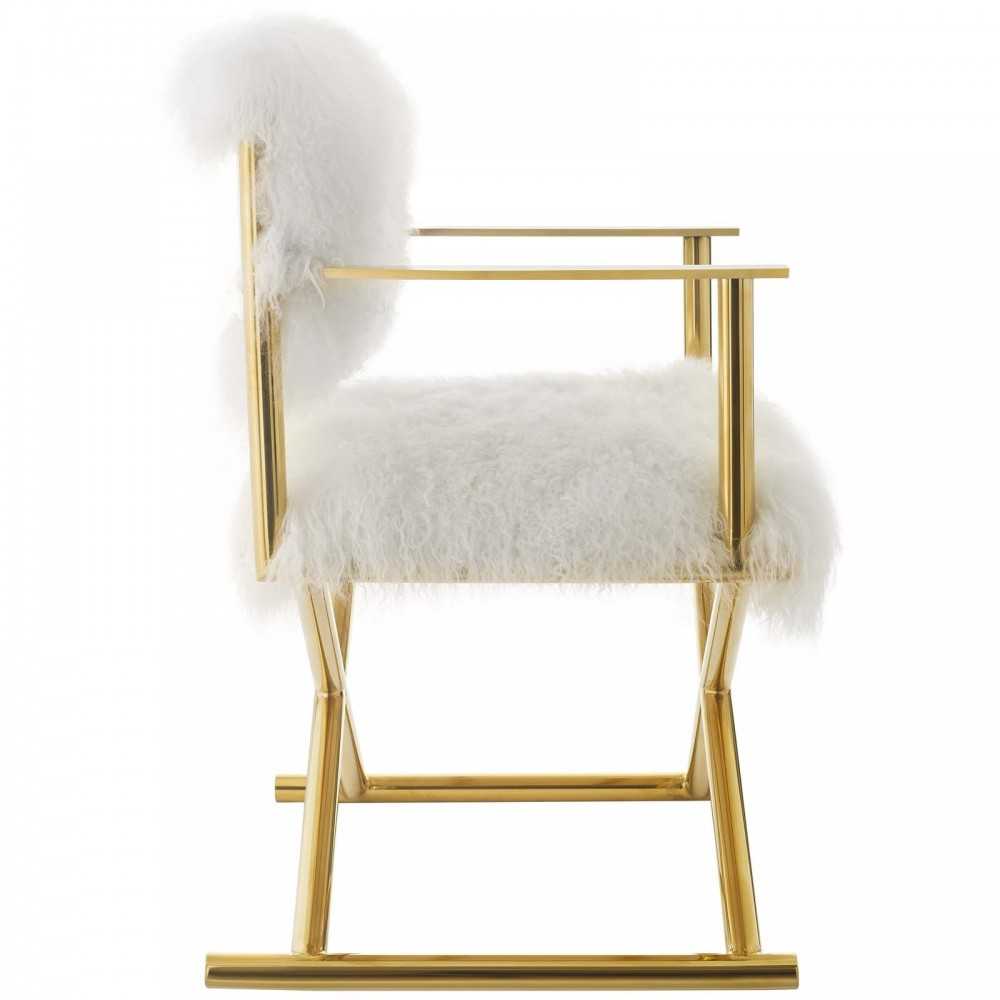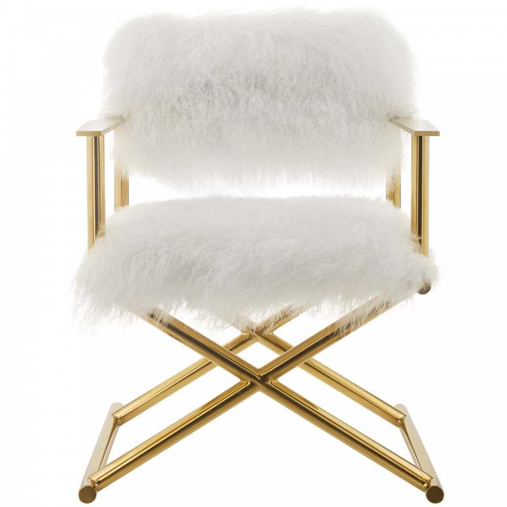 Let the cameras roll on the luxe glam look of the Action Director's Chair. Perfect as an accent chair in the bedroom, living room or vanity, Action is a chic update to the classic director's chair with its elegant fur detail, dense foam padding, and stylish look. This modern accent armchair comes upholstered in a luxurious, softly textured 4" long, pure white sheepskin fur seat and back, and is supported by a polished gold stainless steel frame with white plastic foot caps to protect your floors. Accentuate your modern decor with this upscale accent director's chair that elevates the look of any home or apartment. Comes Fully Assembled, Base Is Not Collapsible. Weight Capacity: 221 lbs.