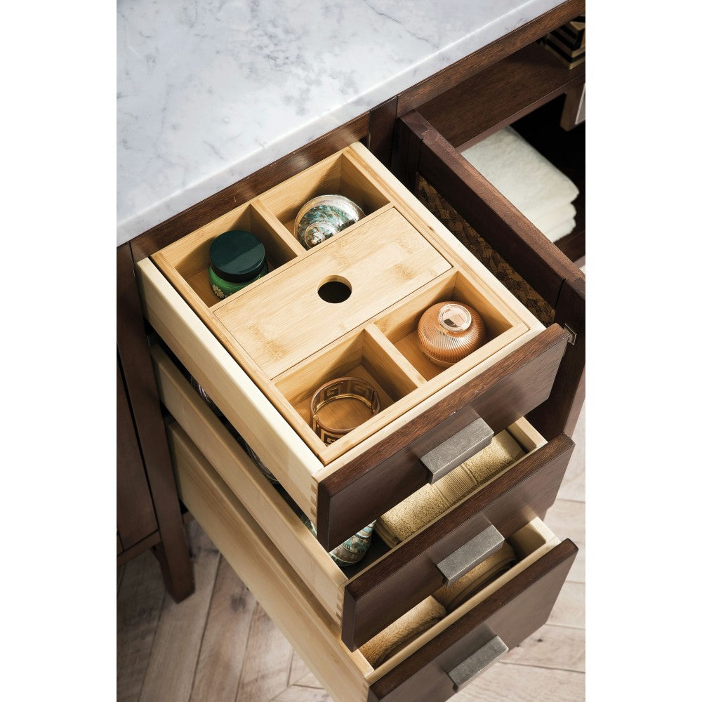 Addison 72" Double Vanity Cabinet, Mid Century Acacia, w/ 3 CM Carrara White Top