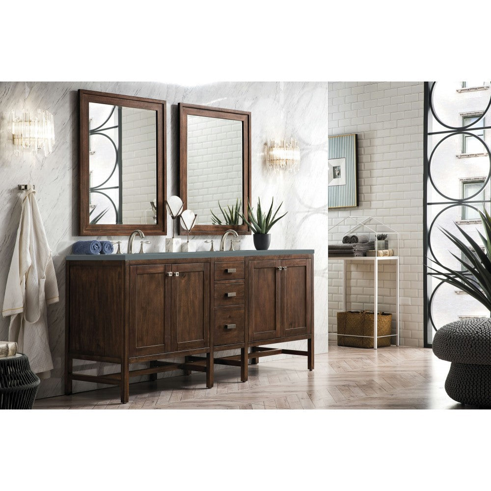 The Addison Collection 72-in. Free-standing Double Vanity by James Martin Vanities comes in a mid-century finish on parawood giving you a fresh take on Shaker-inspired design with a look of luxury. Handcrafted and gender-neutral, it fits effortlessly into modern or transitional rooms. The Shaker touch comes from the sides, drawers, and doors. Each of the drawers feature full extensions with a undermounted slides as well as a brushed aluminum finished laminate that goes on the bottom of the drawer for easy clean up and like the door has a soft-close. The body of the cabinet is made of solid hardwood and sturdy panels of MDF. The Cala Blue bathroom vanity top features a deep and stimulating blue color which, in its interplay with light, balances between the depth and the surface of the sea. A sophisticated blue color that vibrates with the rest of the elements that surround it.