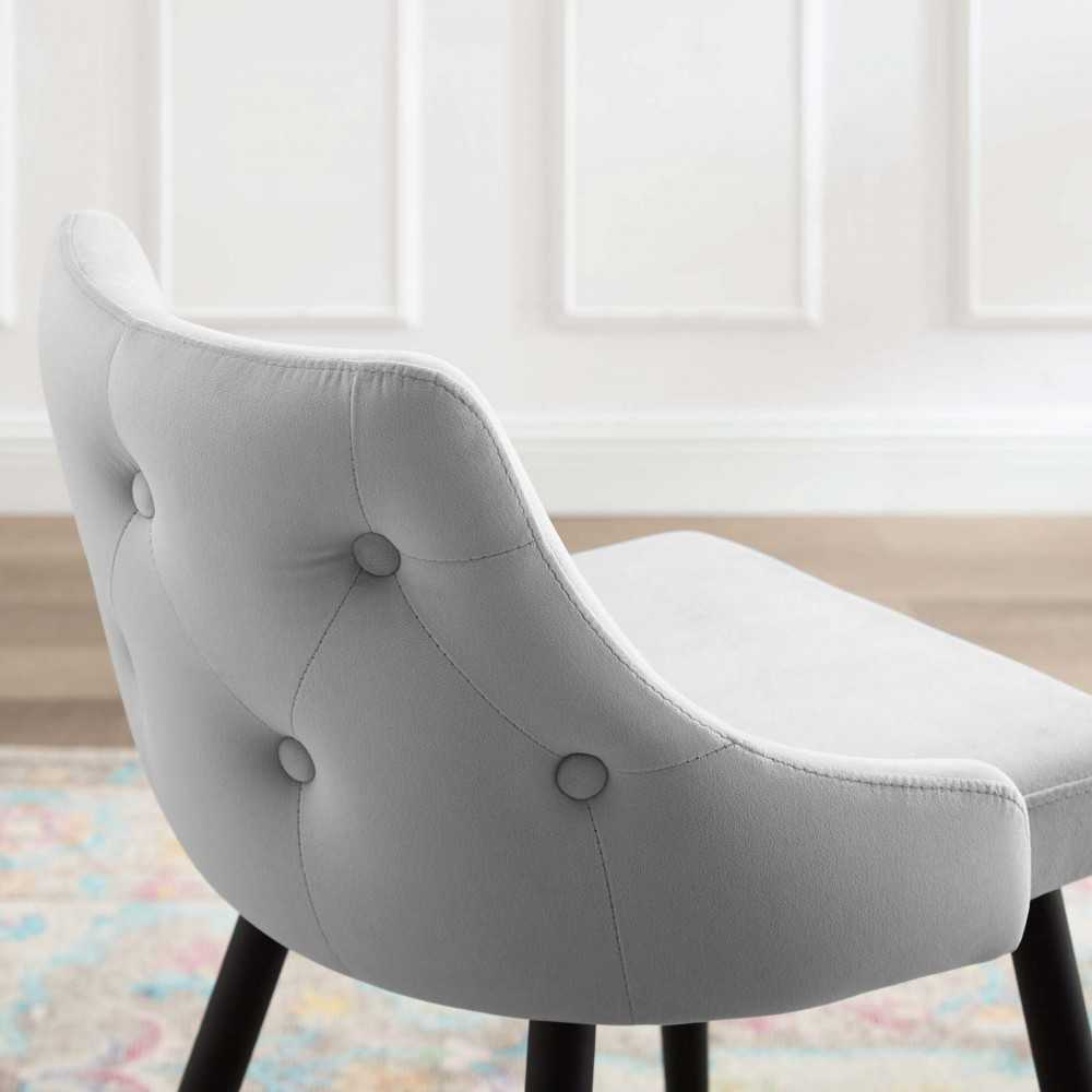 Revitalize dining room or kitchen decor with the Adorn Performance Velvet Counter Stool. Classic button tufting along the stool's exterior and graceful sweeping lines blend seamlessly into the lush comfort of this counter stool. Covered with soft stain-resistant performance velvet, this upholstered counter stool offers a comfortable place to dine with a dense foam padded seat. Sitting on four black tapered legs with gold foot sleeves, Adorn's vintage modern style and glam deco charm makes this counter stool ideally suited for a counter-height bar table or kitchen island, or even as an accompaniment to a drafting desk in the home office. This modern dining counter stool supports up to 300 lbs. and is complete with non-marking foot caps to protect your flooring. No assembly required.