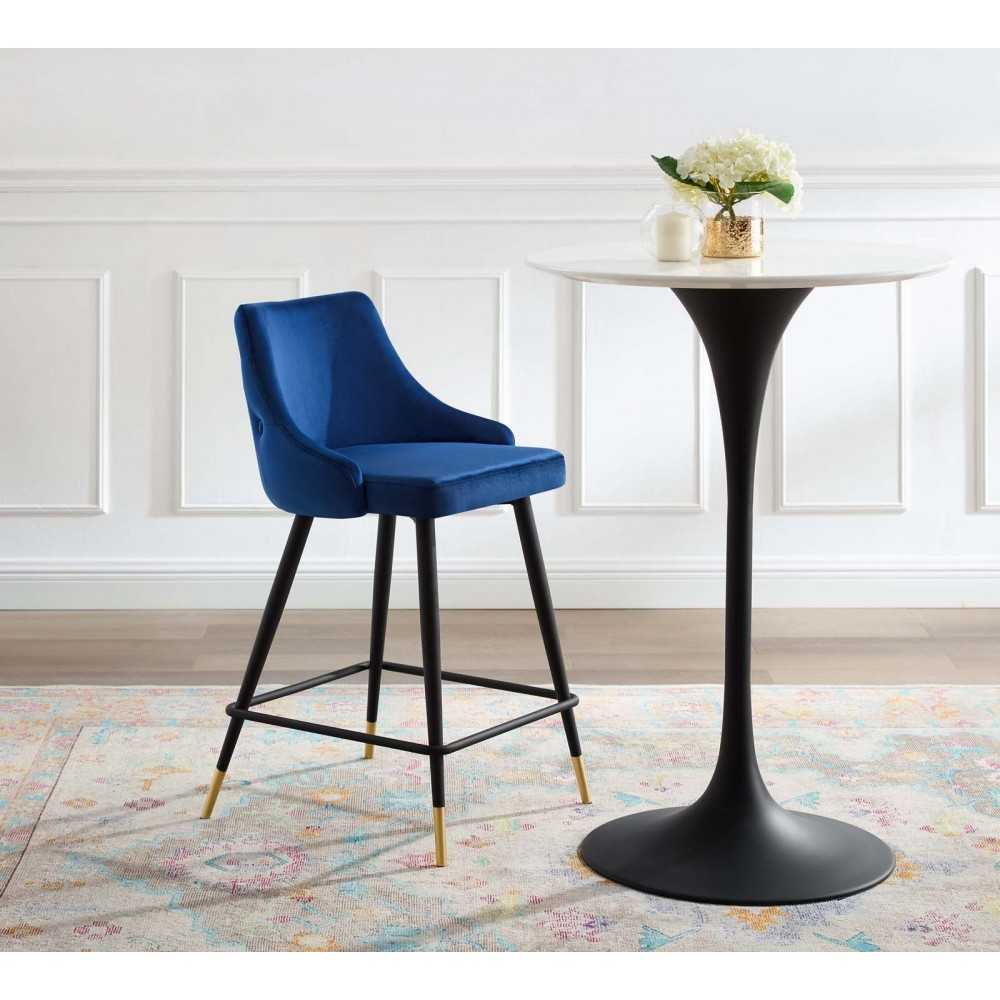 Revitalize dining room or kitchen decor with the Adorn Performance Velvet Counter Stool. Classic button tufting along the stool's exterior and graceful sweeping lines blend seamlessly into the lush comfort of this counter stool. Covered with soft stain-resistant performance velvet, this upholstered counter stool offers a comfortable place to dine with a dense foam padded seat. Sitting on four black tapered legs with gold foot sleeves, Adorn's vintage modern style and glam deco charm makes this counter stool ideally suited for a counter-height bar table or kitchen island, or even as an accompaniment to a drafting desk in the home office. This modern dining counter stool supports up to 300 lbs. and is complete with non-marking foot caps to protect your flooring. No assembly required.