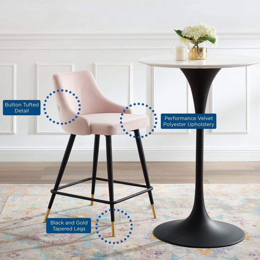Revitalize dining room or kitchen decor with the Adorn Performance Velvet Counter Stool. Classic button tufting along the stool's exterior and graceful sweeping lines blend seamlessly into the lush comfort of this counter stool. Covered with soft stain-resistant performance velvet, this upholstered counter stool offers a comfortable place to dine with a dense foam padded seat. Sitting on four black tapered legs with gold foot sleeves, Adorn's vintage modern style and glam deco charm makes this counter stool ideally suited for a counter-height bar table or kitchen island, or even as an accompaniment to a drafting desk in the home office. This modern dining counter stool supports up to 300 lbs. and is complete with non-marking foot caps to protect your flooring. No assembly required.