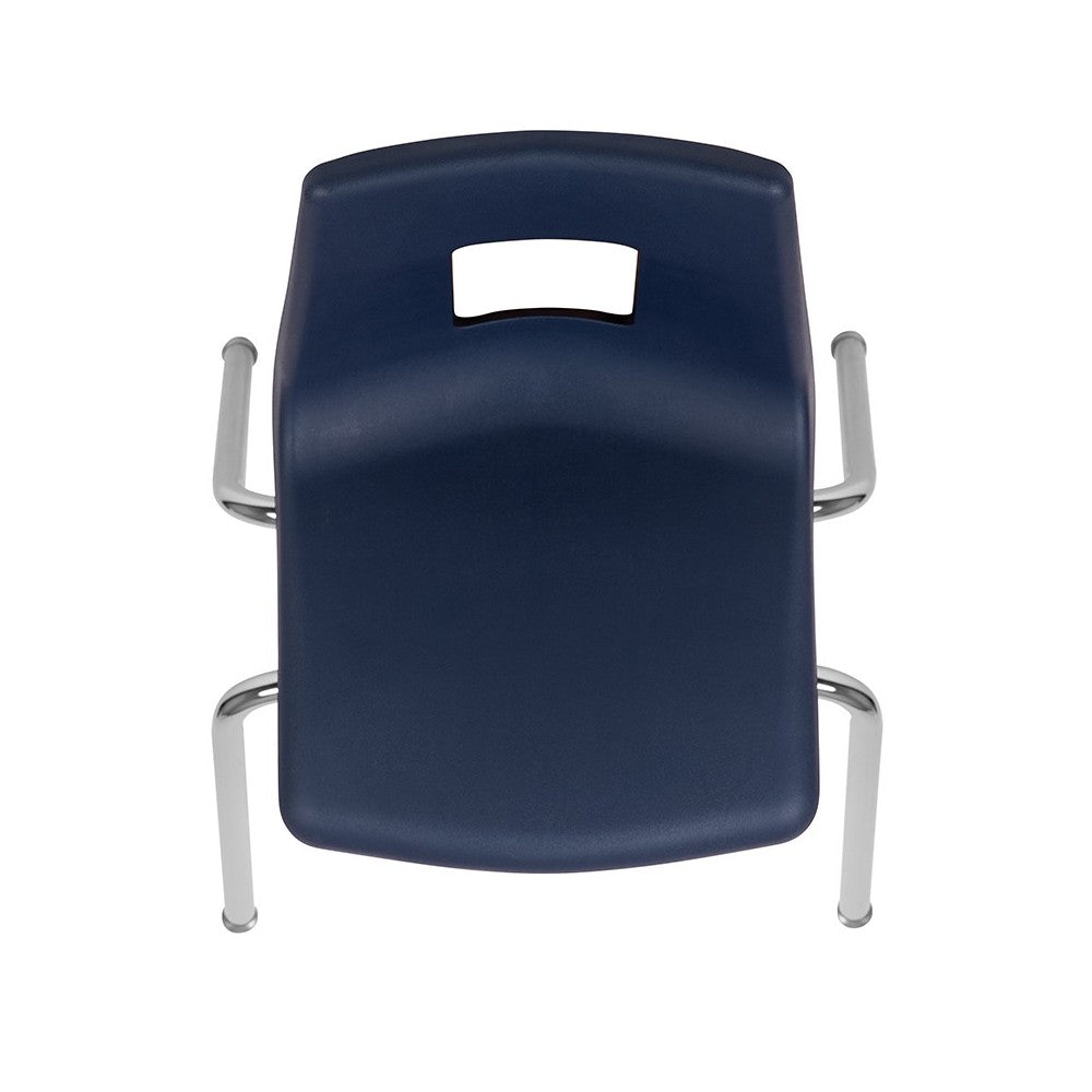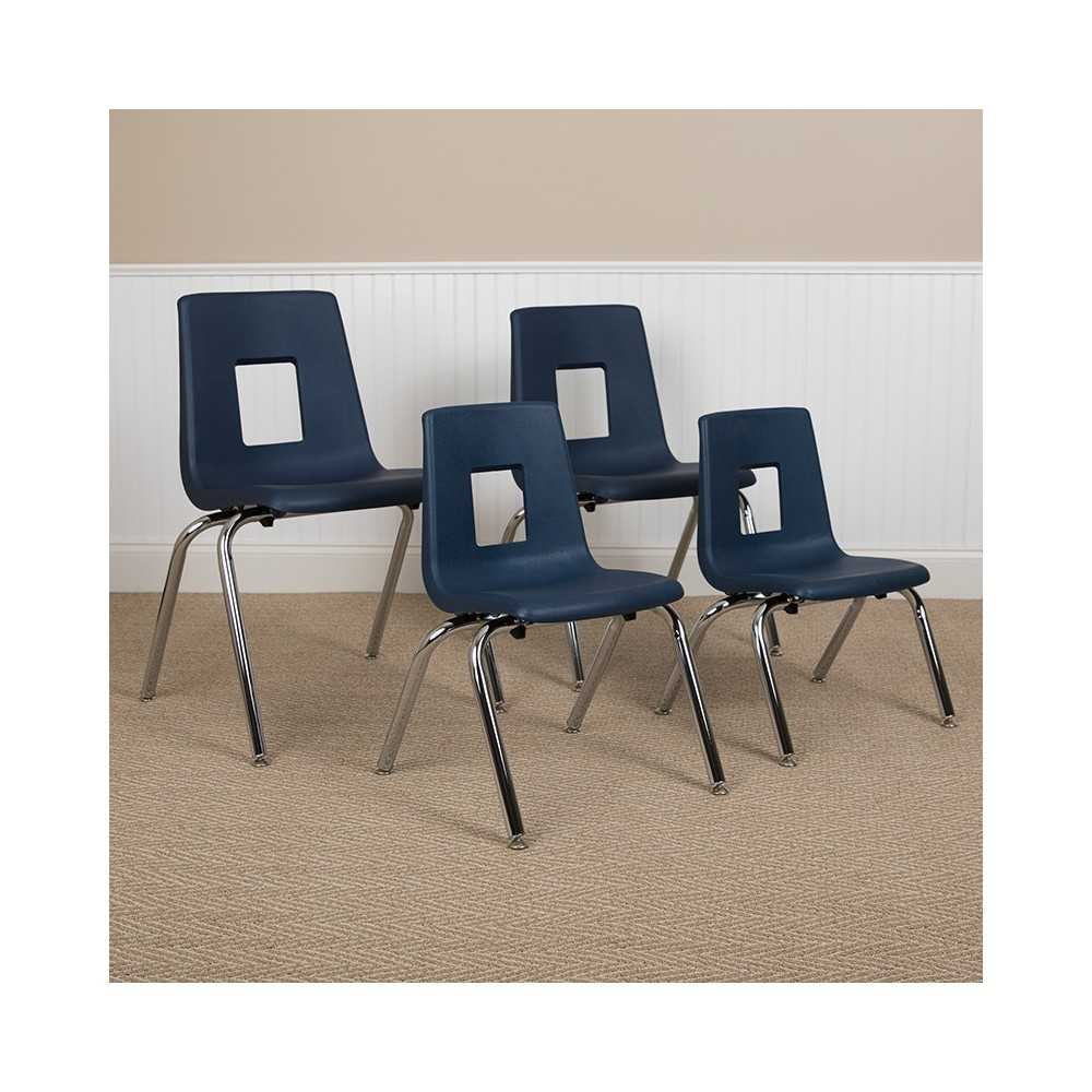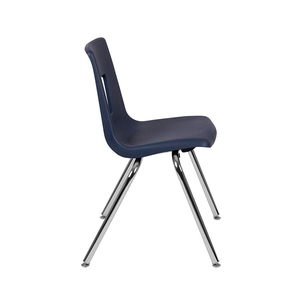 Furnish your classroom, training room and adult education facilities with seating designed for comfort during educational courses and workshops. With an open-back for airflow this classic student stack chair will keep students comfortable to focus on the educator. The classroom oriented student stack school chair features a heavy-duty navy seat shell made of superior high-density polypropylene, ergonomically shaped for maximum student seating comfort and 18-gauge bright nickel, chrome plated frame. The seat shell is designed to promote student seating comfort and correct seating posture for enhanced learning. Non-exposed rivets hold the school chair shell to the strong, non-corrosive steel frame while nylon tip glides on each leg help protect delicate floor surfaces. This ergonomic stack chair provides a stylish and durable classroom seating solution. The chair stacks up to 12 chairs high to provide ease of cleaning and maximum storage within the classroom. This well constructed, stackable school chair provides an unparalleled level of durability and value to exceed your classroom seating needs. [ADV-SSC-18NAVY]