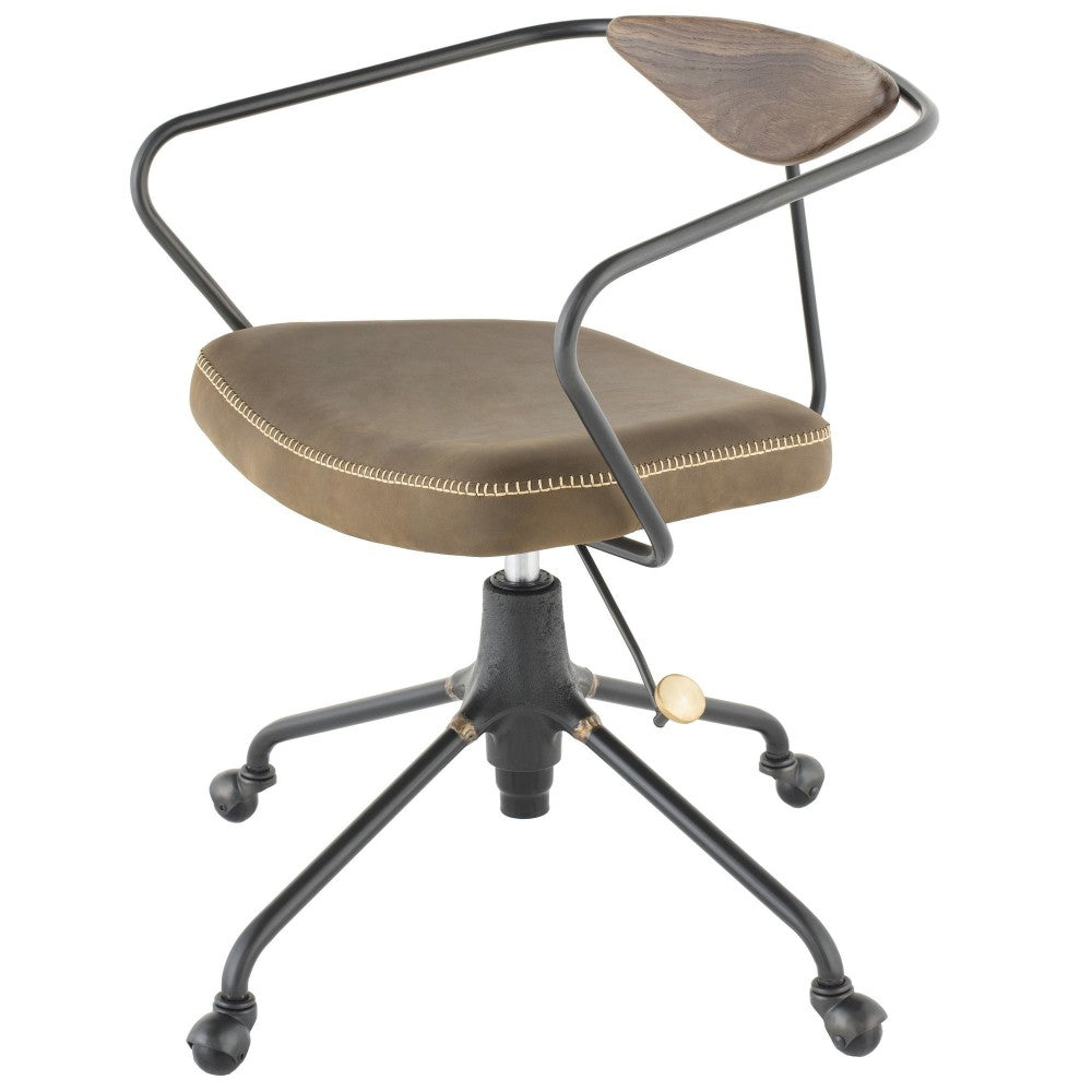 The Akron office chair fuses a wooden back, cast-iron body, contrast-stitched leather seat, and bronze-handled adjustment lever--all with a smart, satisfying coherence.