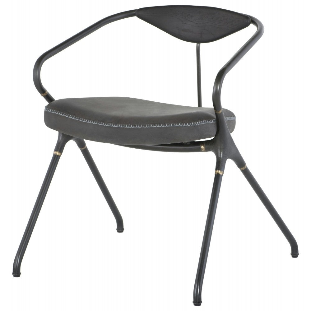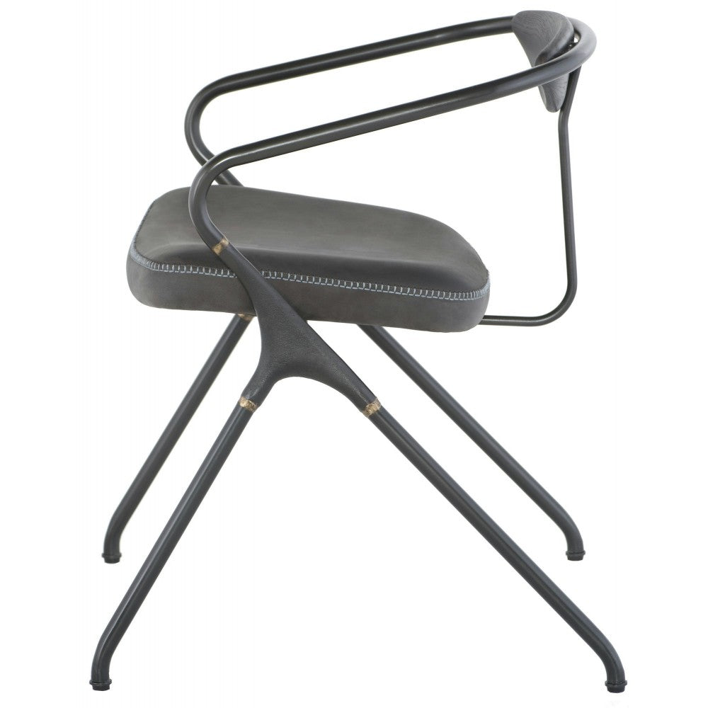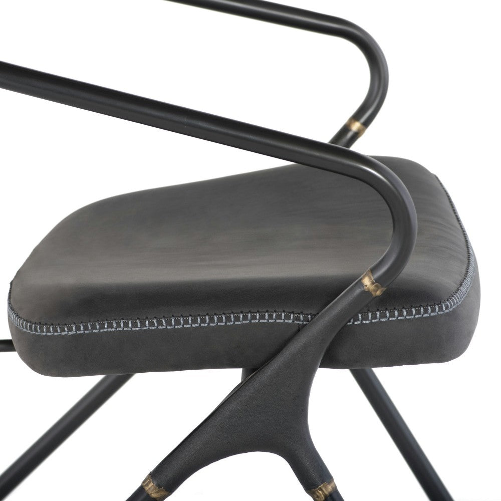 The Akron dining chair employs the minimum of materials to create a fluid functional original. It features a bent steel frame connected with brass brazed cast iron supporting a leather seat and a solid oak backrest.