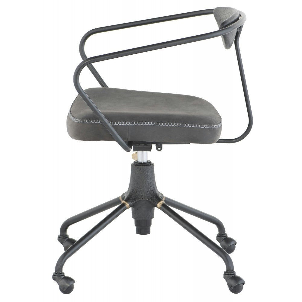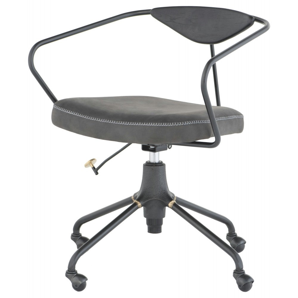 The Akron office chair fuses a wooden back, cast-iron body, contrast-stitched leather seat, and bronze-handled adjustment lever--all with a smart, satisfying coherence.