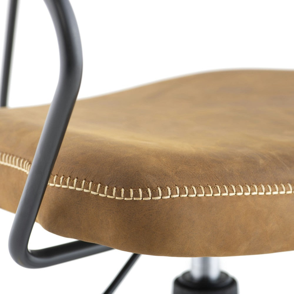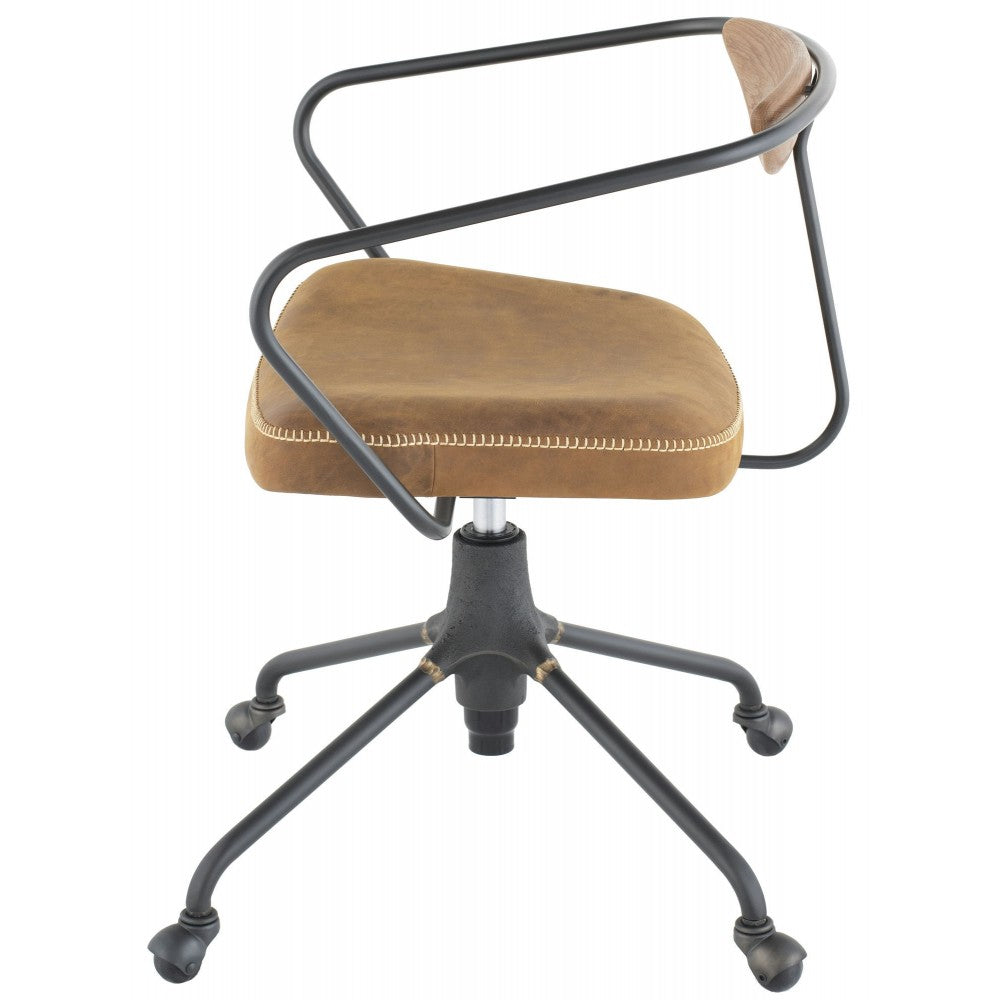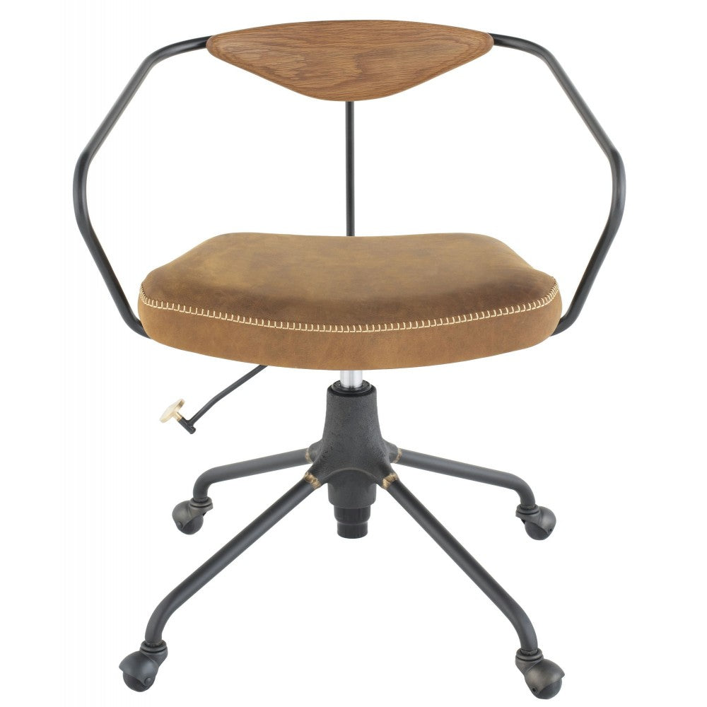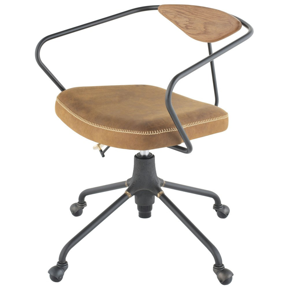 The Akron office chair fuses a wooden back, cast-iron body, contrast-stitched leather seat, and bronze-handled adjustment lever--all with a smart, satisfying coherence.