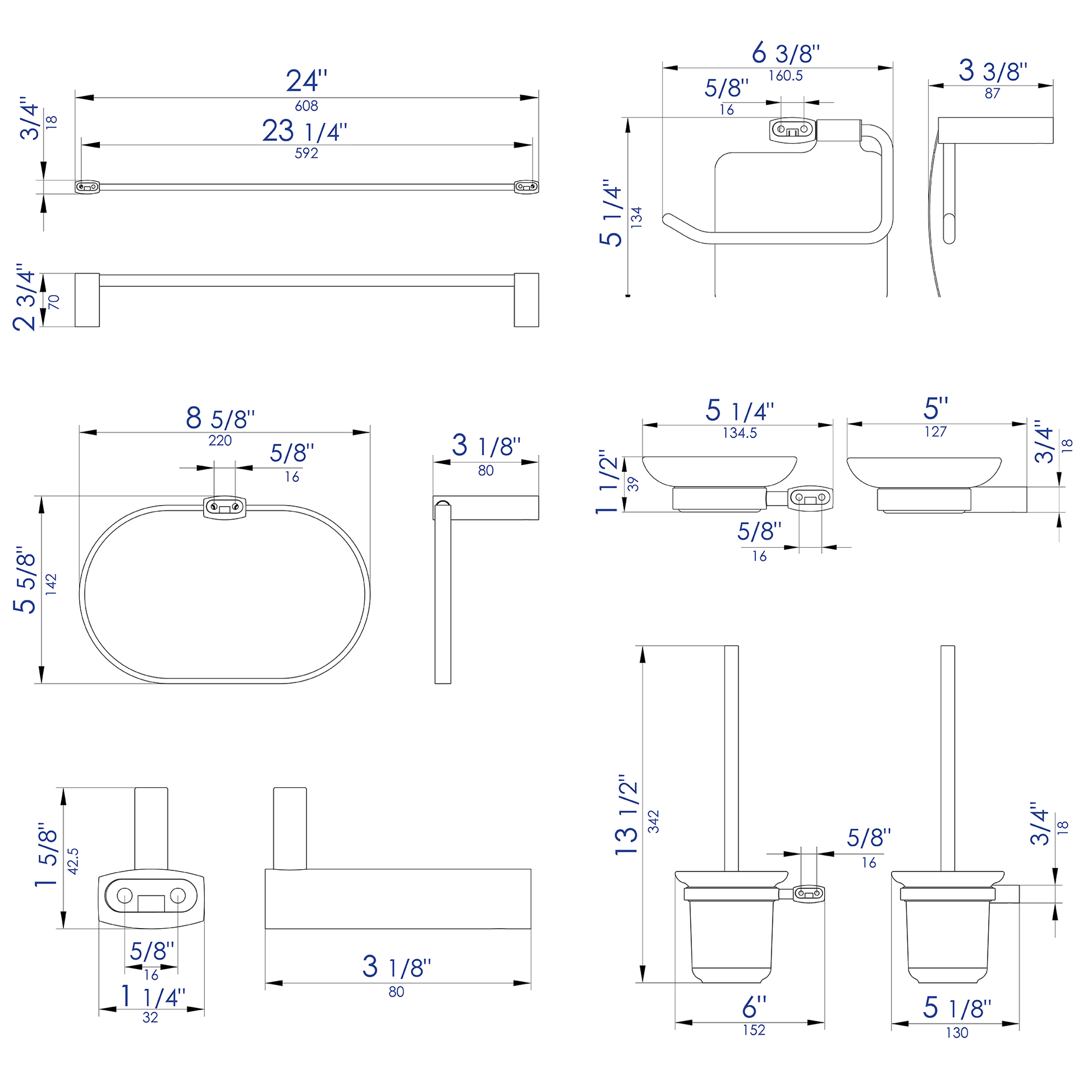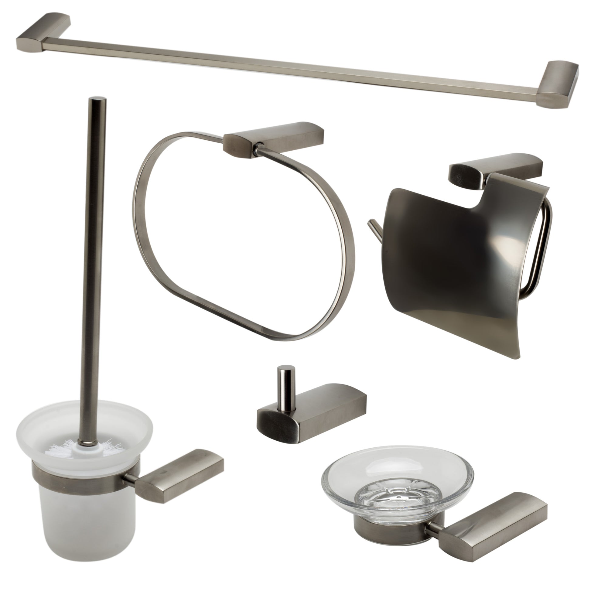 - 6 Piece Set Includes: Towel Bar, Towel Ring, Robe Hook, Soap Dish, Toilet Brush Holder & Toilet Paper Holder.
