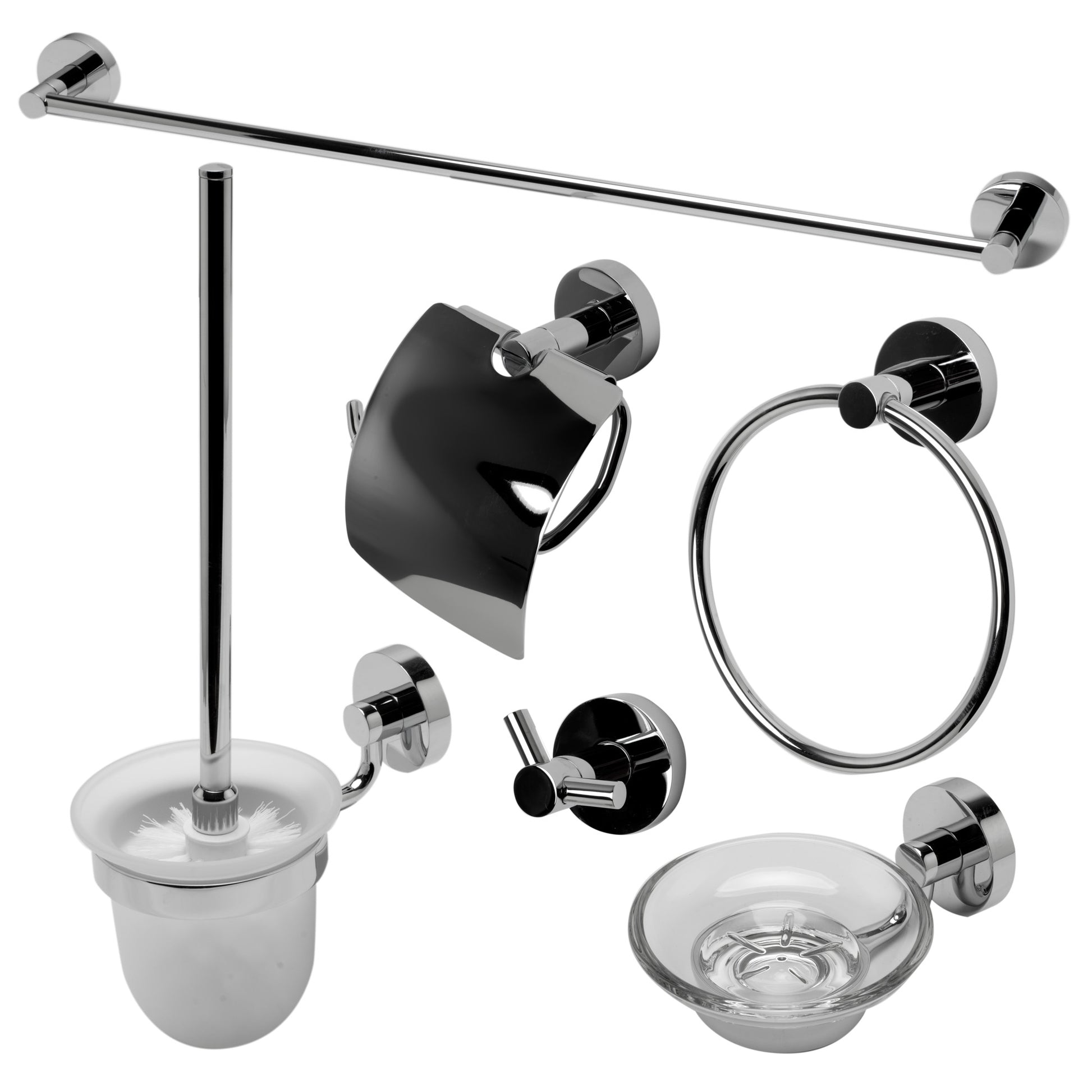 - 6 Piece Set Includes: Towel Bar, Towel Ring, Robe Hook, Soap Dish, Toilet Brush Holder & Toilet Paper Holder.