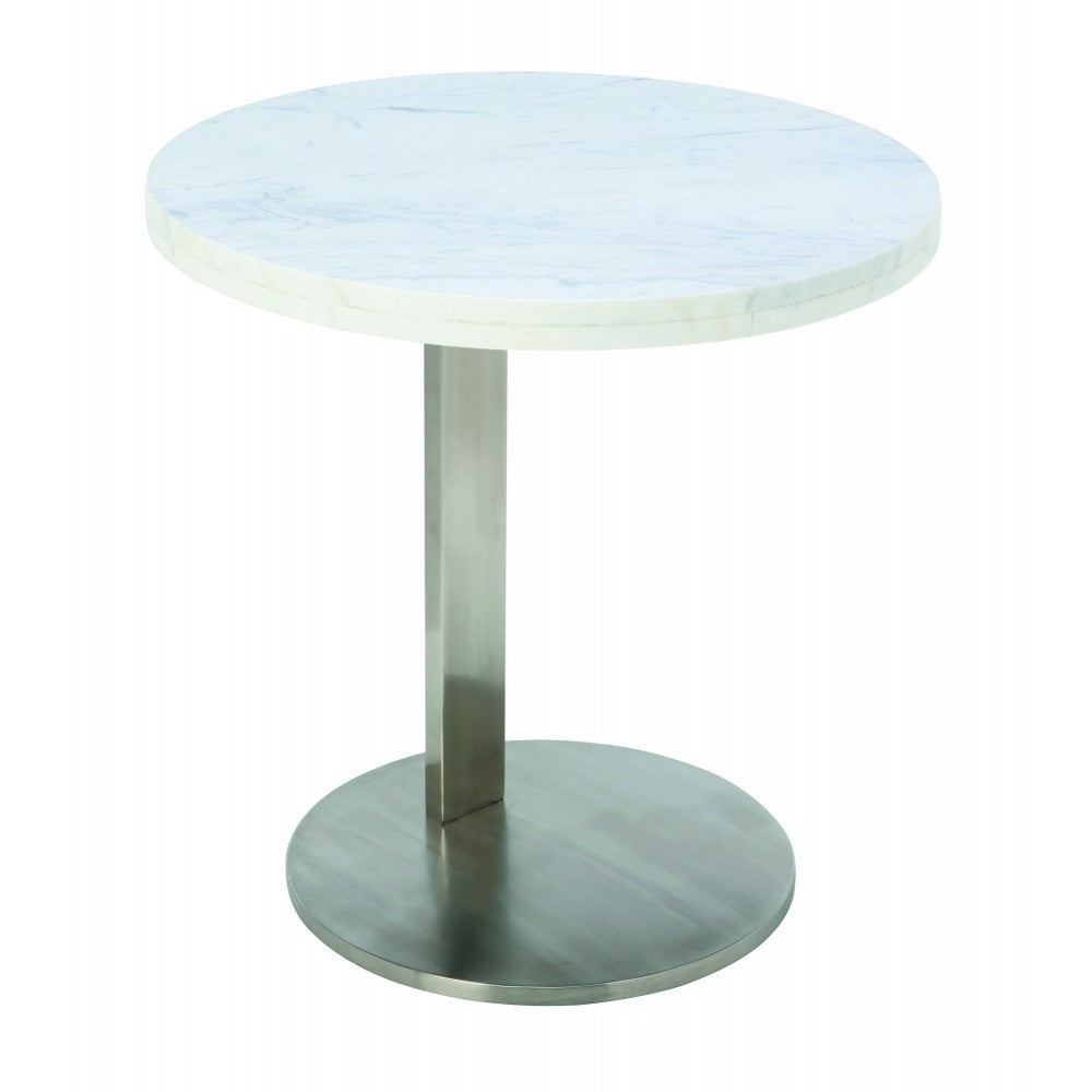 The Alize side table exemplifies pure contemporary design. A circular base and column in brushed stainless steel supports a round marble table top. The simple echo of circular form representing the essence of minimalism. Each piece of marble is expertly crafted out of a unique piece of natural stone, creating beautiful variations and one-of-a-kind details.