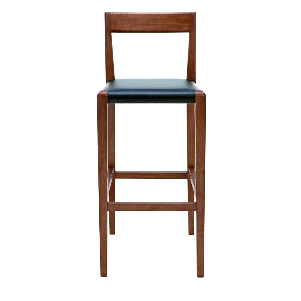 The Ameri counter stool augments a traditional wooden frame with fine, Scandinavian lines, lifting and lightening the entire piece. The black leather upholstered seats simple, comfortable, design complements the pared down aesthetic of the solid birch frame finished in walnut stain.