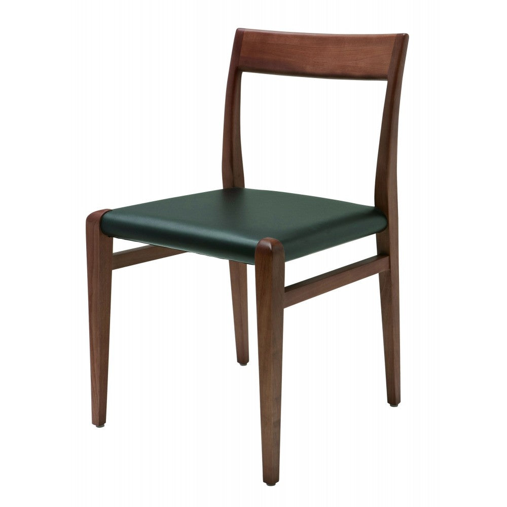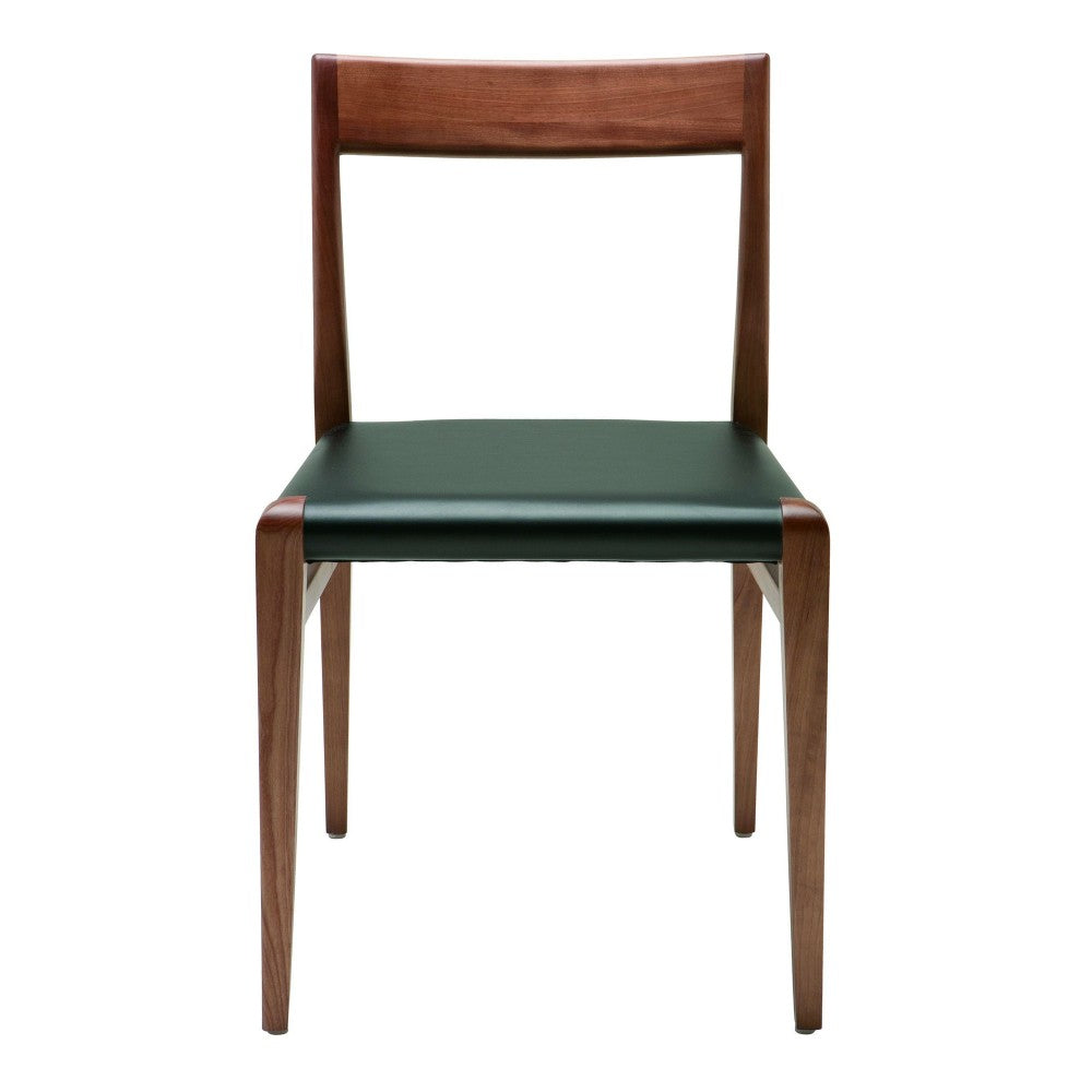 The Ameri dining chair augments a traditional wooden frame with fine, Scandinavian lines, lifting and lightening the entire piece. The black leather upholstered seats simple, comfortable, design complements the pared down aesthetic of the solid birch frame finished in walnut stain.