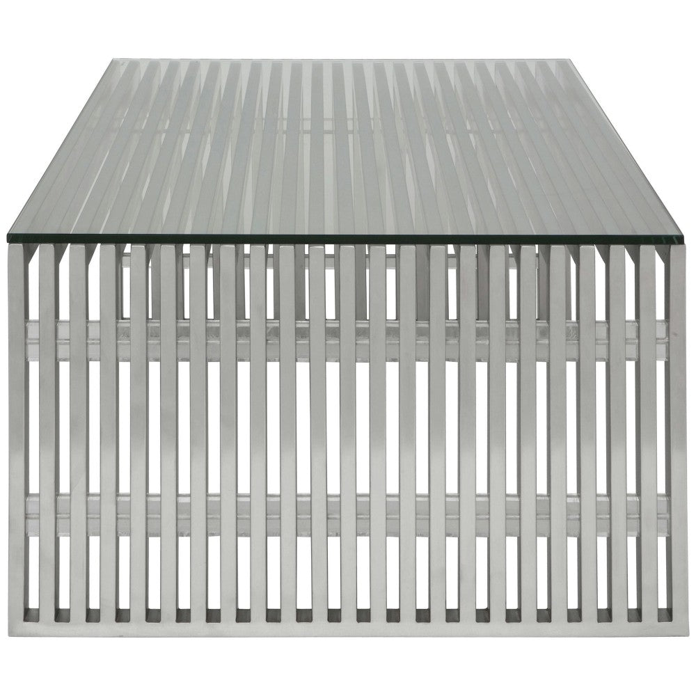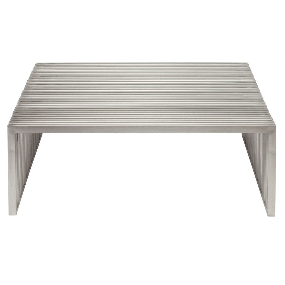 The Amici Coffee Table is a striking example of dynamic, articulated minimalism. The brushed stainless steel frame conveys a linear aesthetic, uniquely modern and textured.