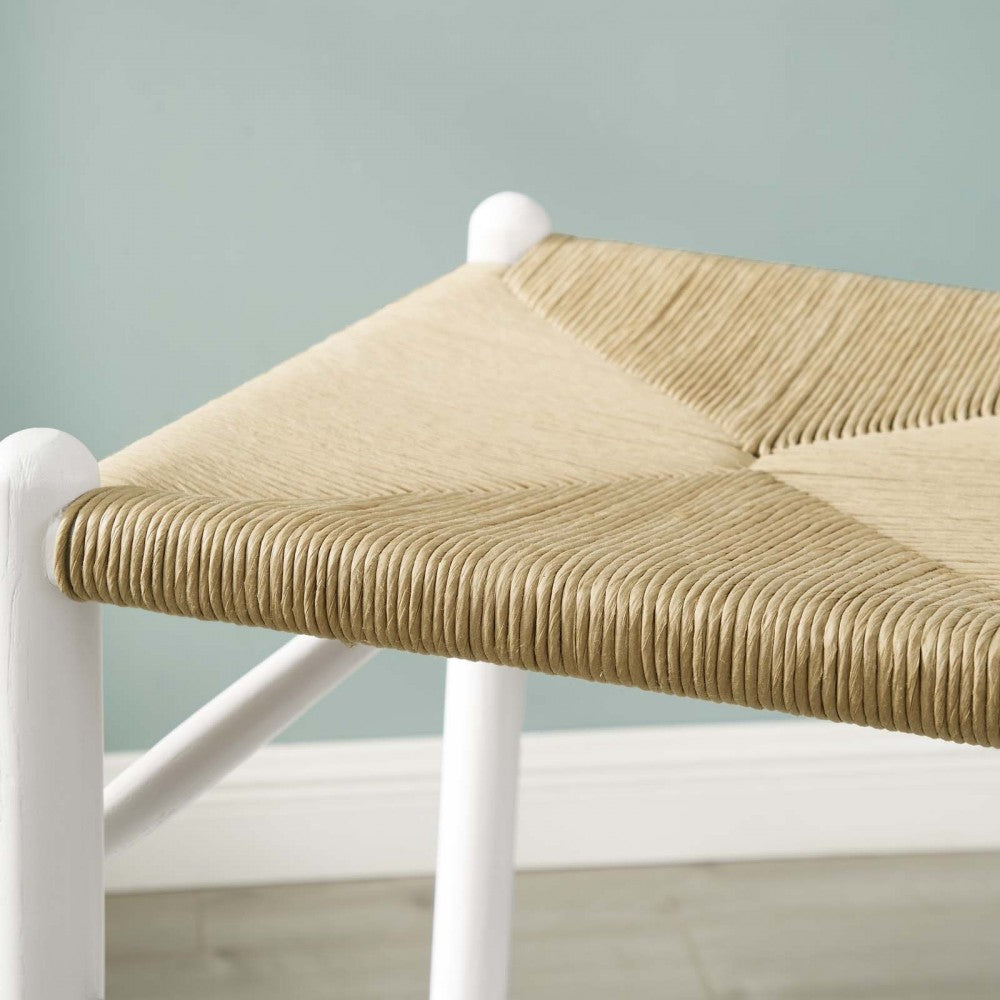 Rustic lines form the flowing frame of Amish Wooden Bar Stool. Set with a mid-century style, the Amish Bar Stool takes the minimalist style into an organic piece bringing natural beauty to your bistro and bar area. Amish features an elm wood half moon armrest, cutaway back, and foot bar supports. A woven paper rope seat ties in a solidly constructed wooden stool for your living room, lounge room, bistro, cafe, and bar area decor. Comes Fully Assembled. Bar Stool Weight Capacity: 331 lbs.
