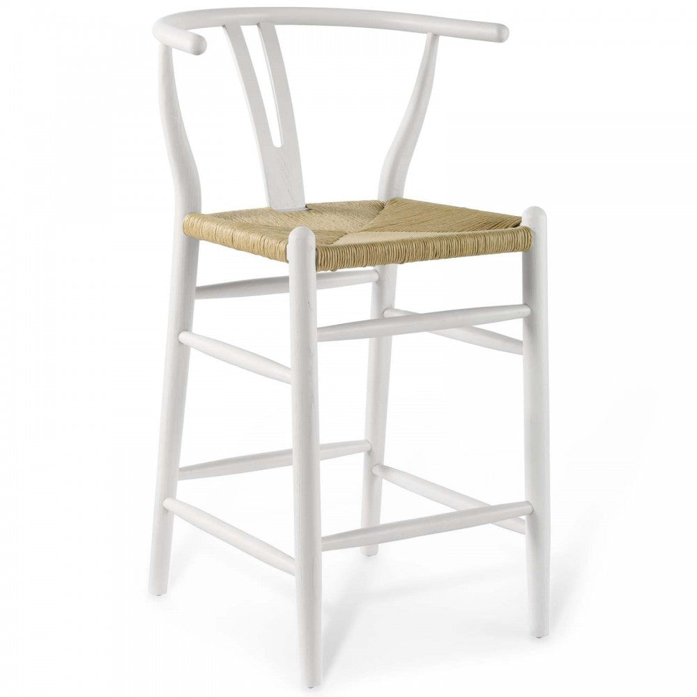 Rustic lines form the flowing frame of Amish Wooden Counter Stool Set of 2. Set with a mid-century modern style, the Amish Counter Stool takes the minimalist style into an organic piece bringing natural beauty to your bistro and bar area. Amish features an elm wood half moon armrest, cutaway back, and foot bar supports. A woven paper rope seat ties in a solidly constructed wooden stool for your living room, lounge room, bistro, cafe, and bar area decor. Comes Fully Assembled.