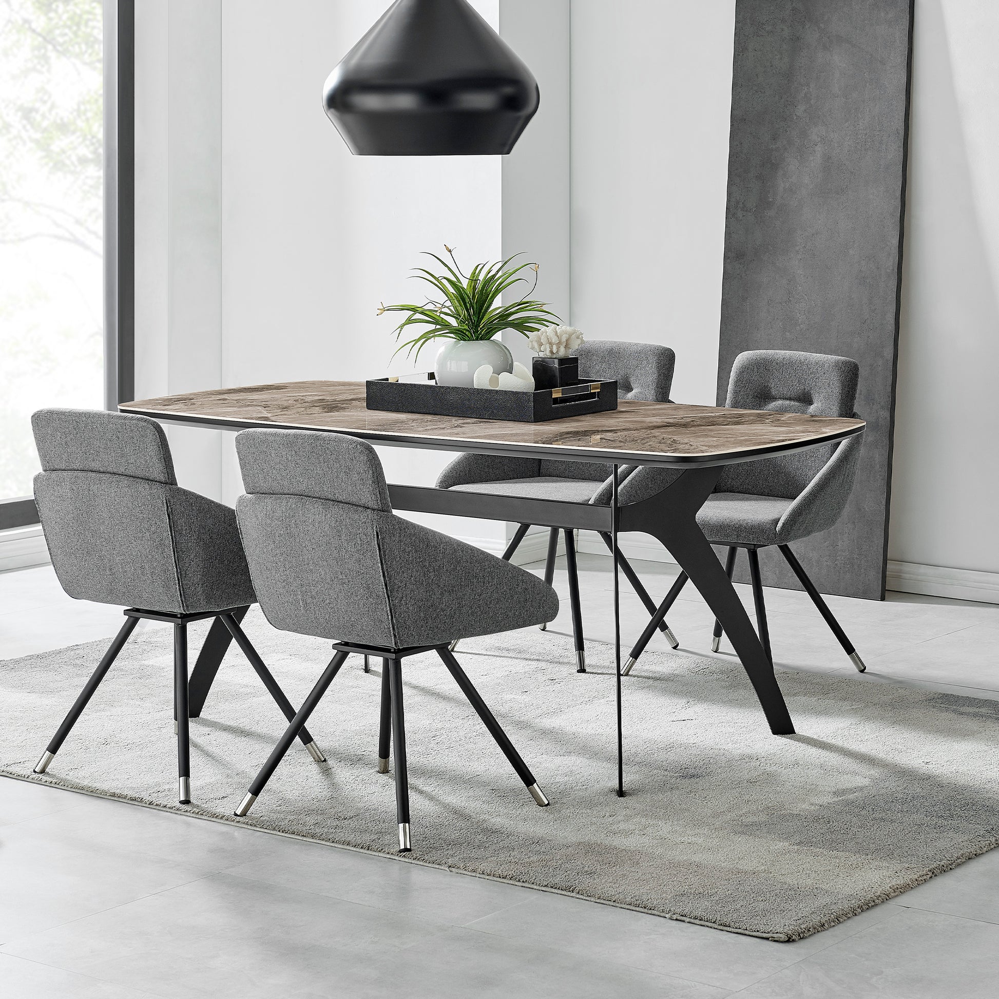 The Andes and Granada 5 Piece Dining Set from Armen Living will make a wonderful addition to your already beautiful home! The soft and sleek fabric is wrapped professionally and elegantly around the thick and plush foam padded cushion. This cushion is beyond comfort - keeping you seated all day long. This dining chair features low arms that surround your waist and body and to keep you feeling secure. The metal frame is crafted with the best materials and will last for many years to come! The Granada is special because of its ability to blend into most home decors - such a versatile piece of furniture! The Andes Dining Table adds a touch of pure sophistication to a kitchen, bar or lounge area, or even a breakfast nook. It features a strong and striking stainless steel 4-legged base, giving it sleek and stunning visual appeal. The rectangular ceramic top completes the elegant look, while also contributing to the durability of this piece - not only easy to clean but will last years for you and your home! Modern in style, this table is perfect for relaxing with a glass of wine after work or enjoying entertaining a large group of guests.
