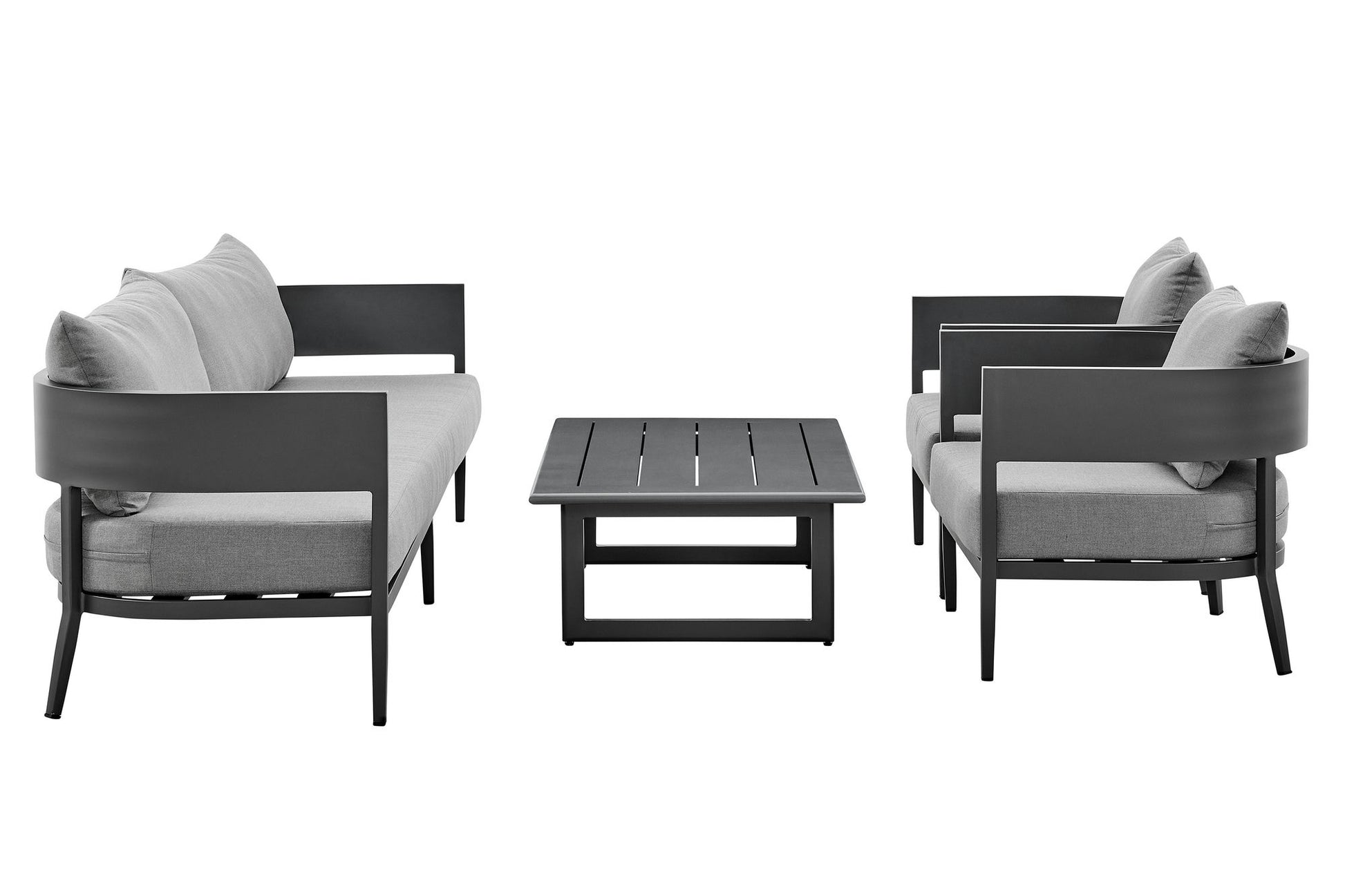 Searching for the perfect outdoor set that fulfills your needs? Look no further than the Argiope 4 Piece Outdoor Aluminum Dark Gray Seating Set with Cushions from Armen Living. The Argiope coffee table is perfect for morning or evening conversations while you watch the sunrise or sunset! The durable outdoor cushions are upholstered with stain, UV, and water-resistant, keeping you worry-free and relaxed - also features highly sought-after removable cushions. All of the items in the Argiope outdoor set are crafted with long-lasting aluminum frames. Featuring 2 club chairs, an outdoor sofa, and a coffee table, this set is ideal for seating up to 5.
