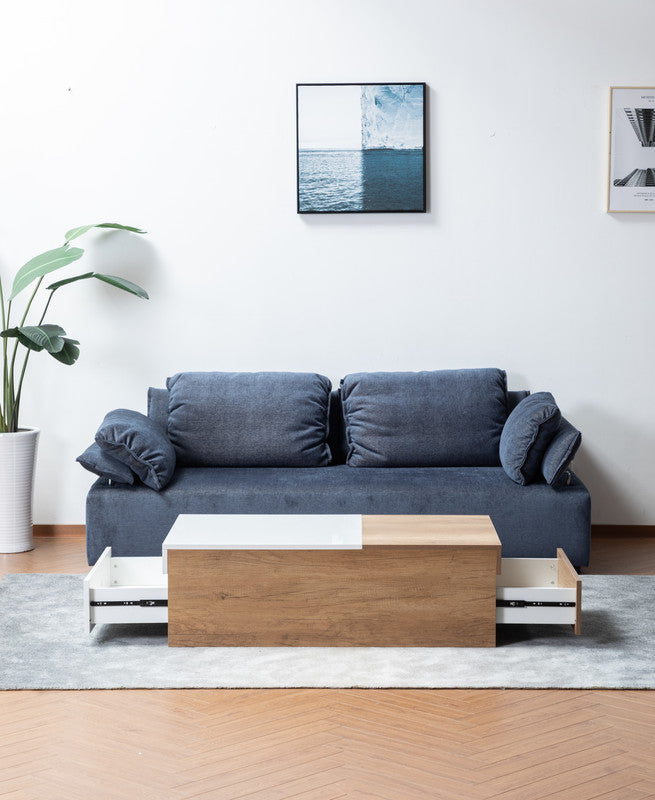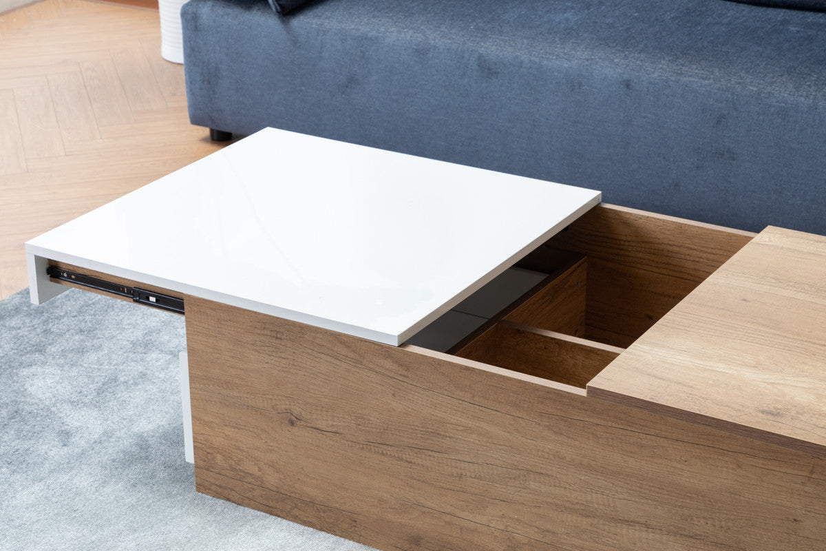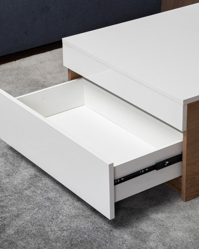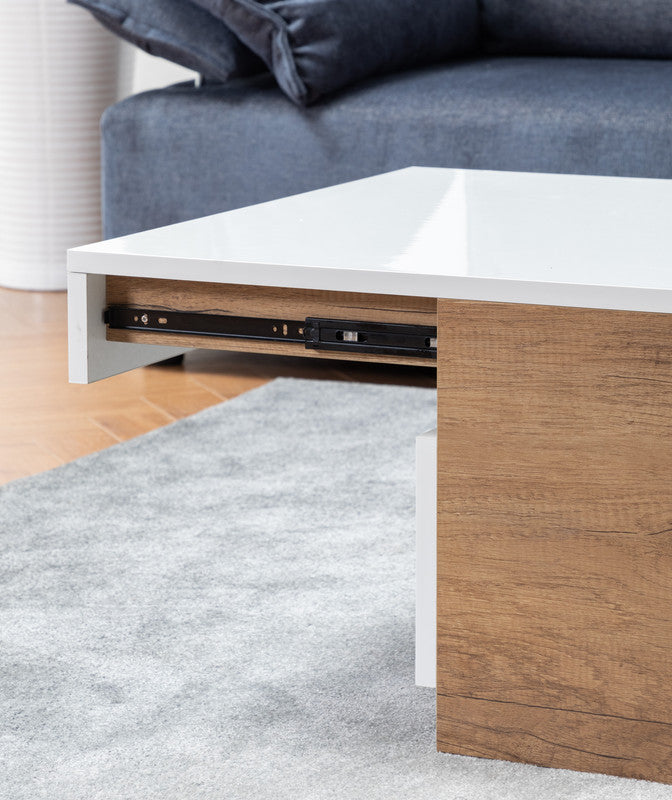 The Arlo brown wood and white finish coffee table features multiple storage spaces. The two drawers and two hidden compartments underneath the sliding tabletop can store all your media essentials. Without compromises on looks, one end of the tabletop slides outwards to reveal the hidden storage space that’s divided into two compartments. Drawers are simplified with their handleless structure. The clean-cut and low profile is perfect for the minimalist design of any living space.