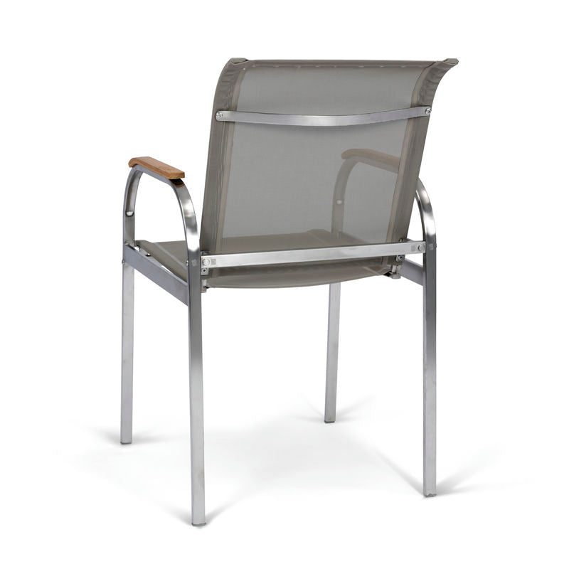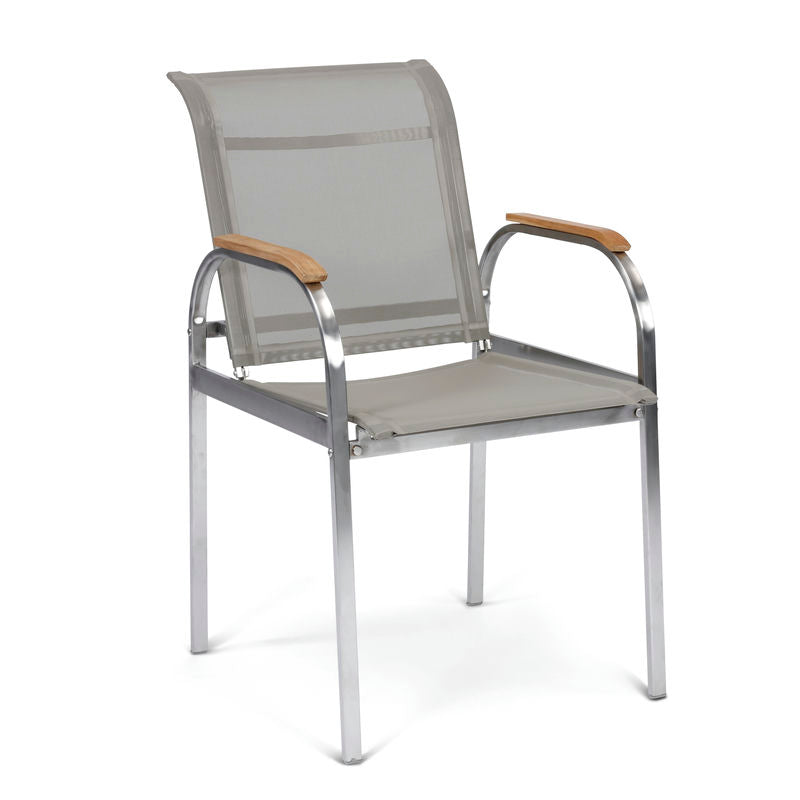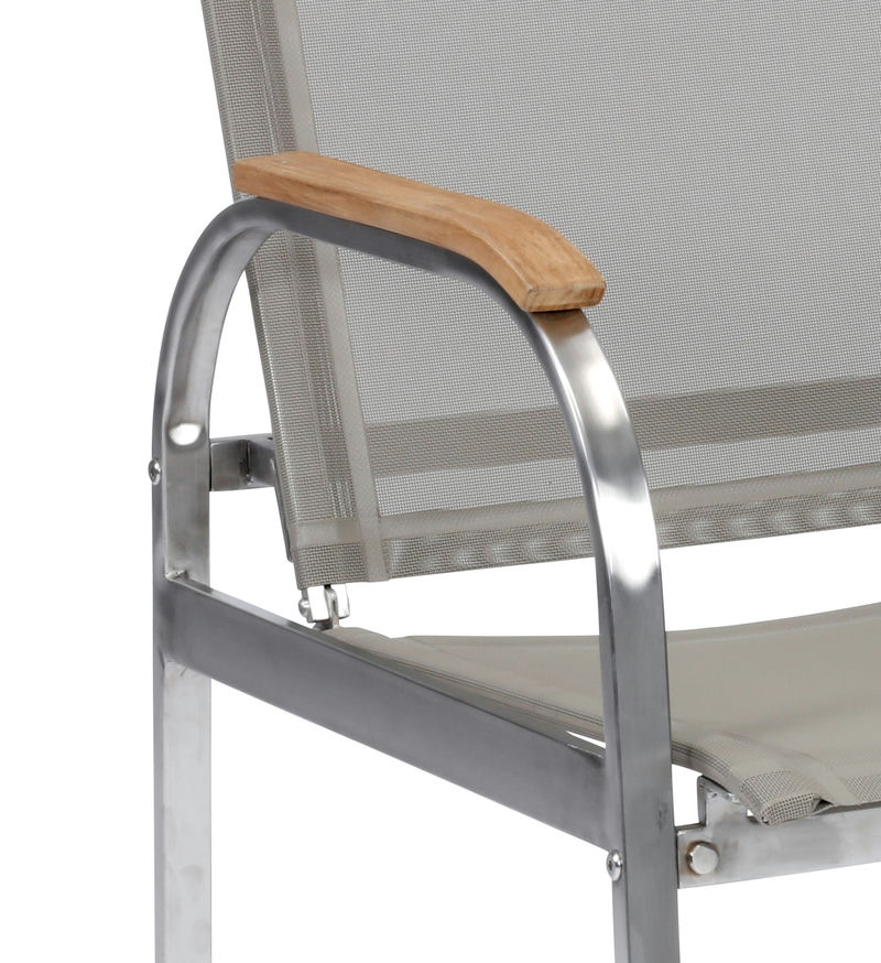 Lounge outdoors in comfort and style with the Aruba Gray Dining Chair (set of 2) by homestyles. This chair features a weather-resistant, polished stainless steel frame. The solid arm rests are sanded and unfinished to showcase the natural beauty of the water-repelling Teak wood. Each chair features a contemporary sling-style seat and back, built to withstand the elements. The lower- and upper-back frame supports add stability and comfort. Finish and measurements may vary. Assembly required. Delivered to your door by parcel service.