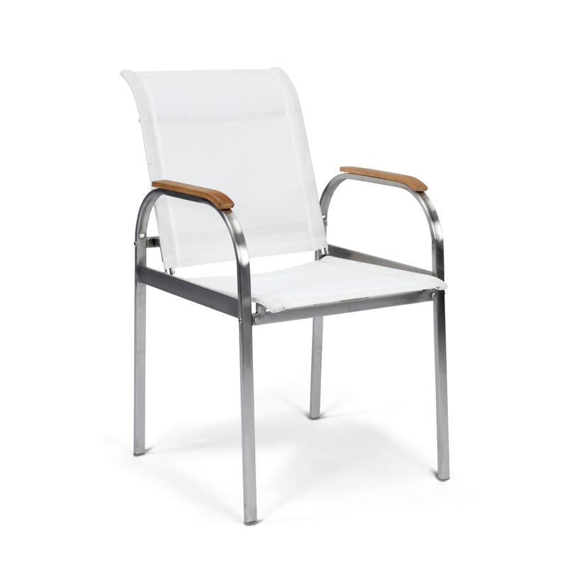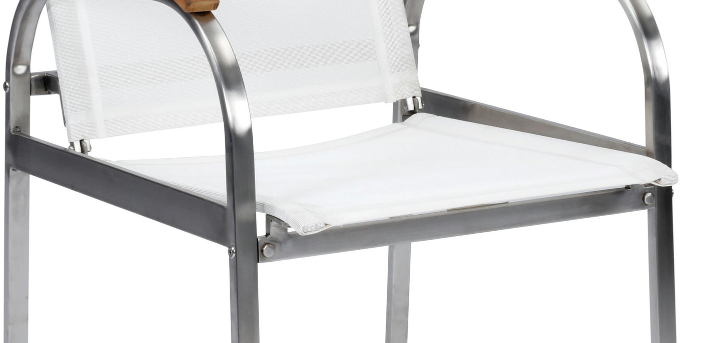 Lounge outdoors in comfort and style with the Aruba Off-White Dining Chair (set of 2) by homestyles. This chair features a weather-resistant, polished stainless steel frame. The solid arm rests are sanded and unfinished to showcase the natural beauty of the water-repelling Teak wood. Each chair features a contemporary sling-style seat and back, built to withstand the elements. The lower- and upper-back frame supports add stability and comfort. Finish and measurements may vary. Assembly required. Delivered to your door by parcel service.