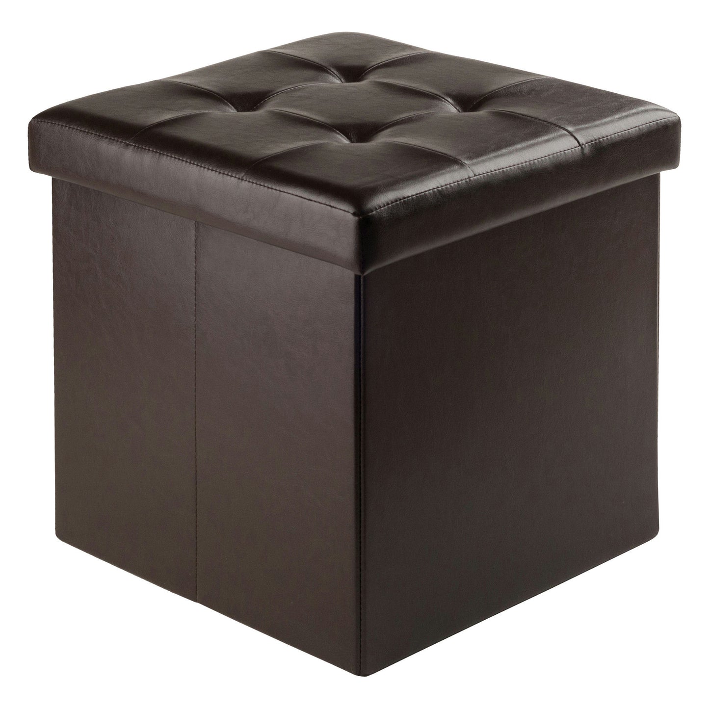 Whether you're relaxing with your feet up or using the Ashford Ottoman as extra seating, this unique piece will also provide plenty of storage. Perfect for keeping extra cushions in the living room, games and toys in the family room, or shoes and clothing in the bedroom. The cushioned faux leather seat lifts away, affording easy access to the storage space inside. The base of the ottoman easily folds so when it is not in use, the unit can be moved or compactly stored. Both base and ottoman top are made of faux leather in Espresso finish. Overall size is 15"H x 15"W x 15"D